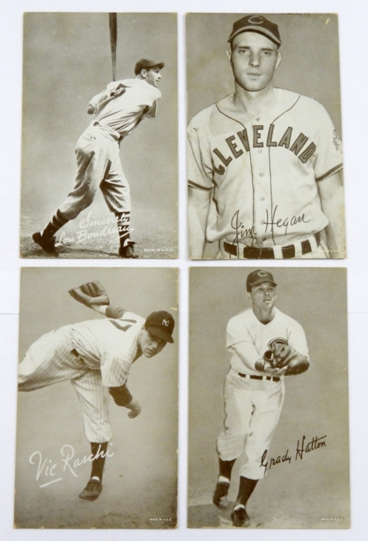 (4 )1947-66 EXHIBITS BASEBALL CARD, VIC RASCHI,GRADY HATTON,JIM HEGAN &LOU BOUDREAU