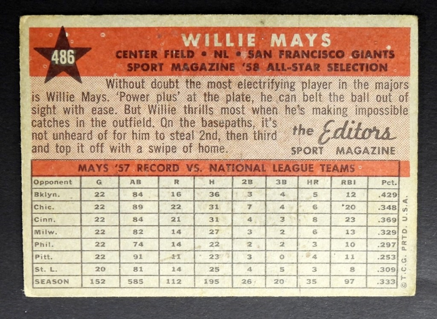 1958 TOPPS #486 WILLIE MAYS VGEX