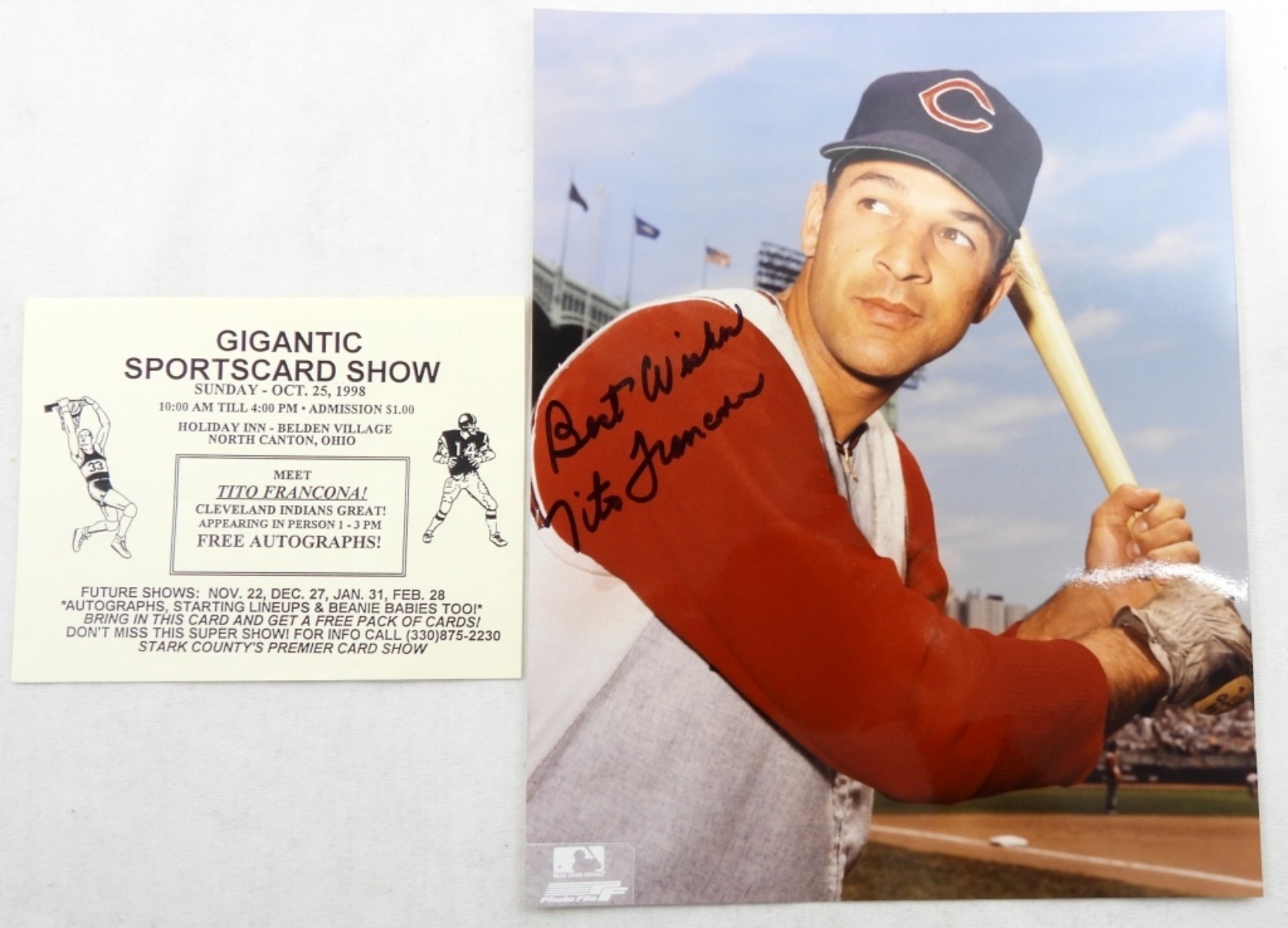 TITO FRANCONA CLEVELAND INDIANS SIGNED 8X10 AND VINTAGE SPORTS CARD SHOW INVITATION( NO COA )
