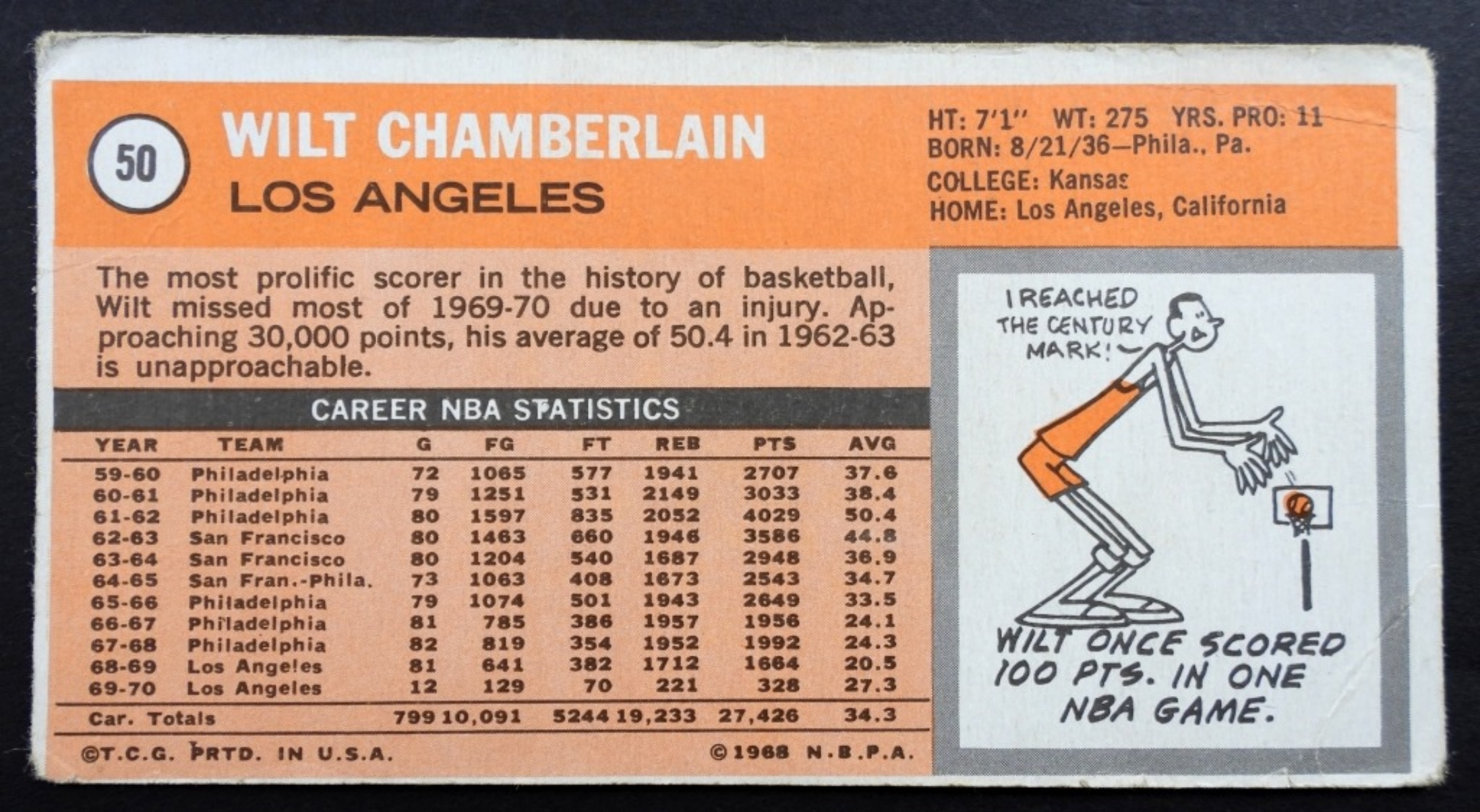 TOPPS BASKETBALL #50 WILT CHAMBERLAIN, LOS ANGELES VG