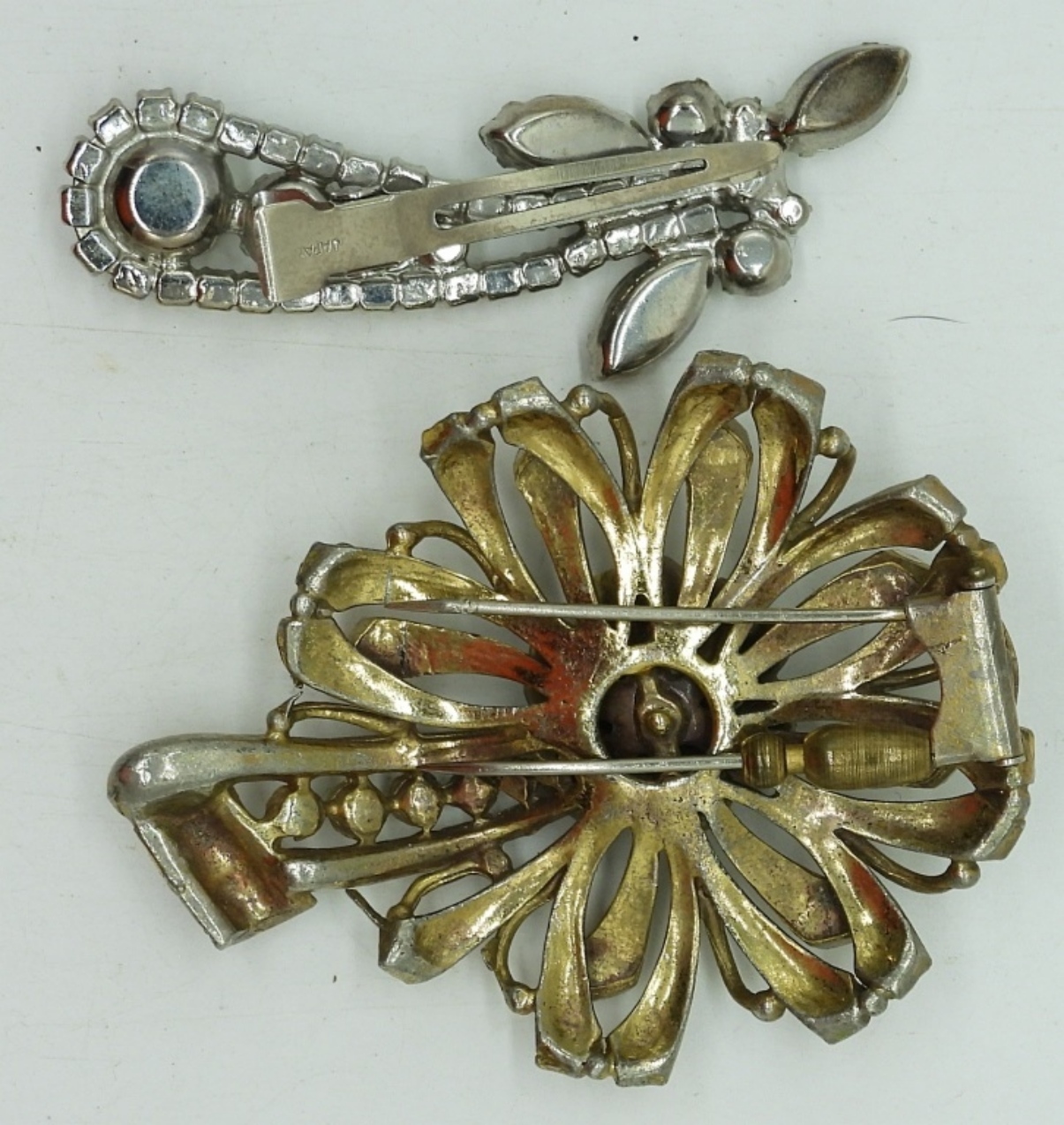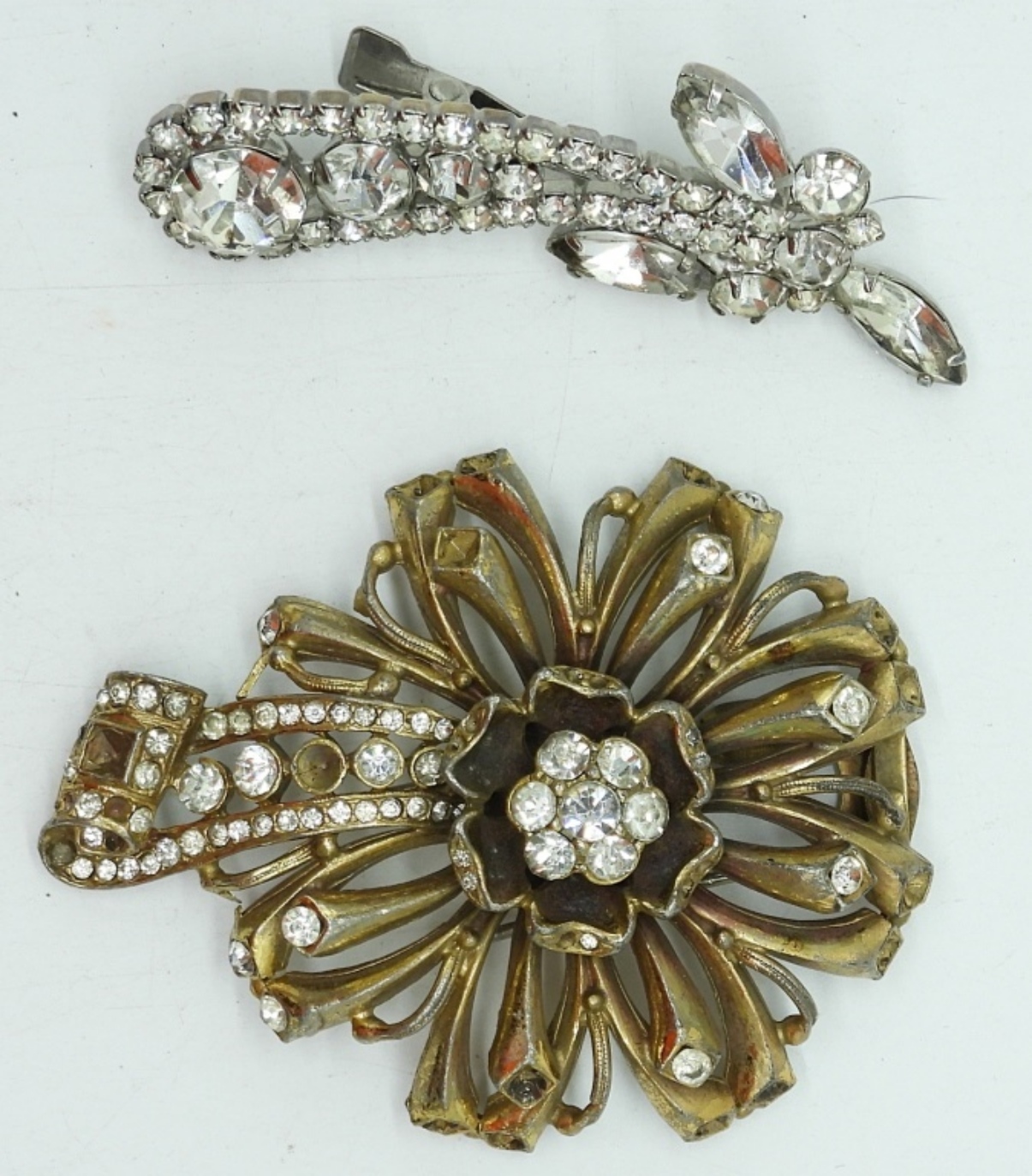 VINTAGE WHITE RHINESTONE HAIR CLIP, 3″. VTG RHINESTONE (MISSING SEVERAL RHINESTONES) H AT CLIP, 3.5″.