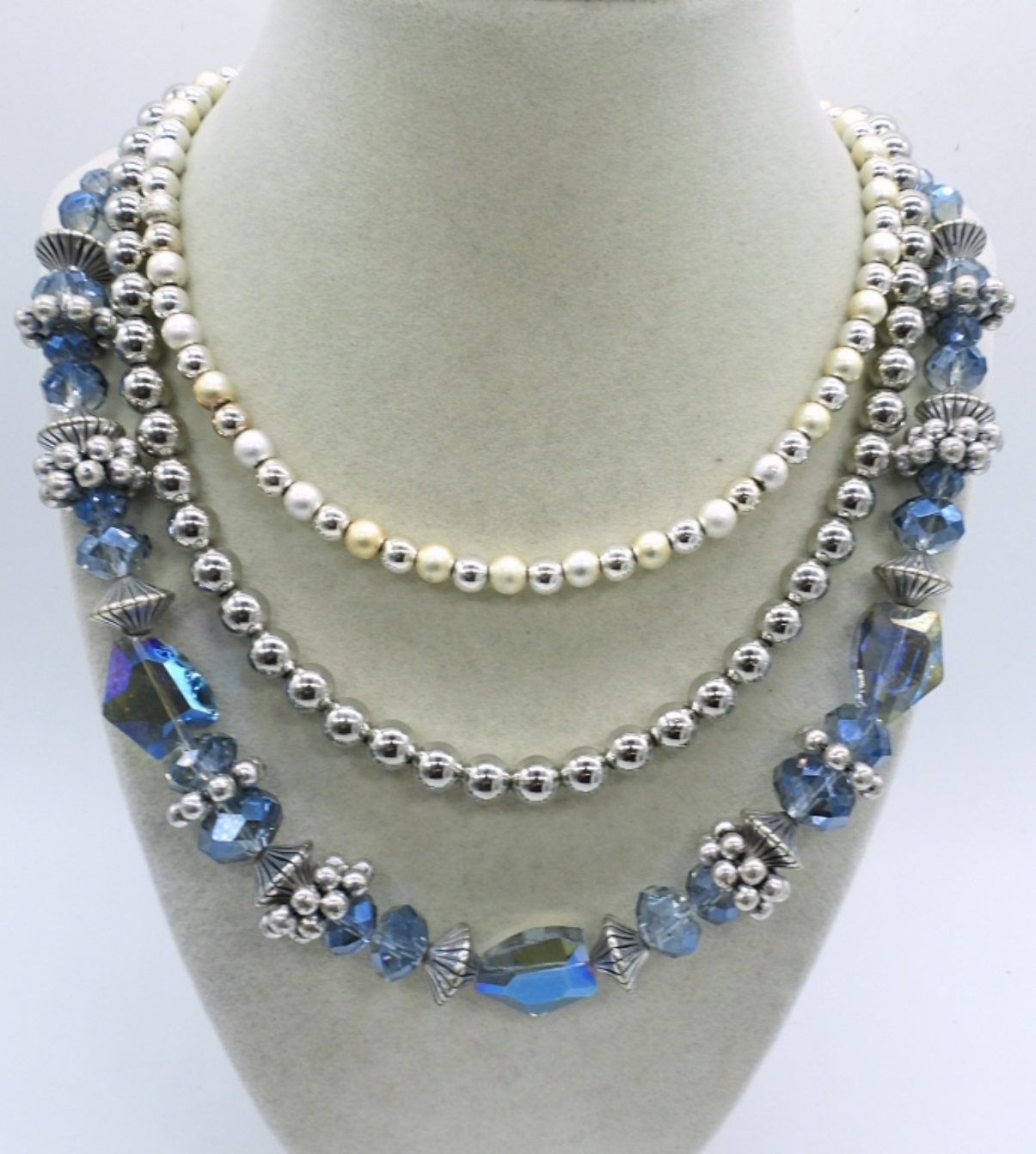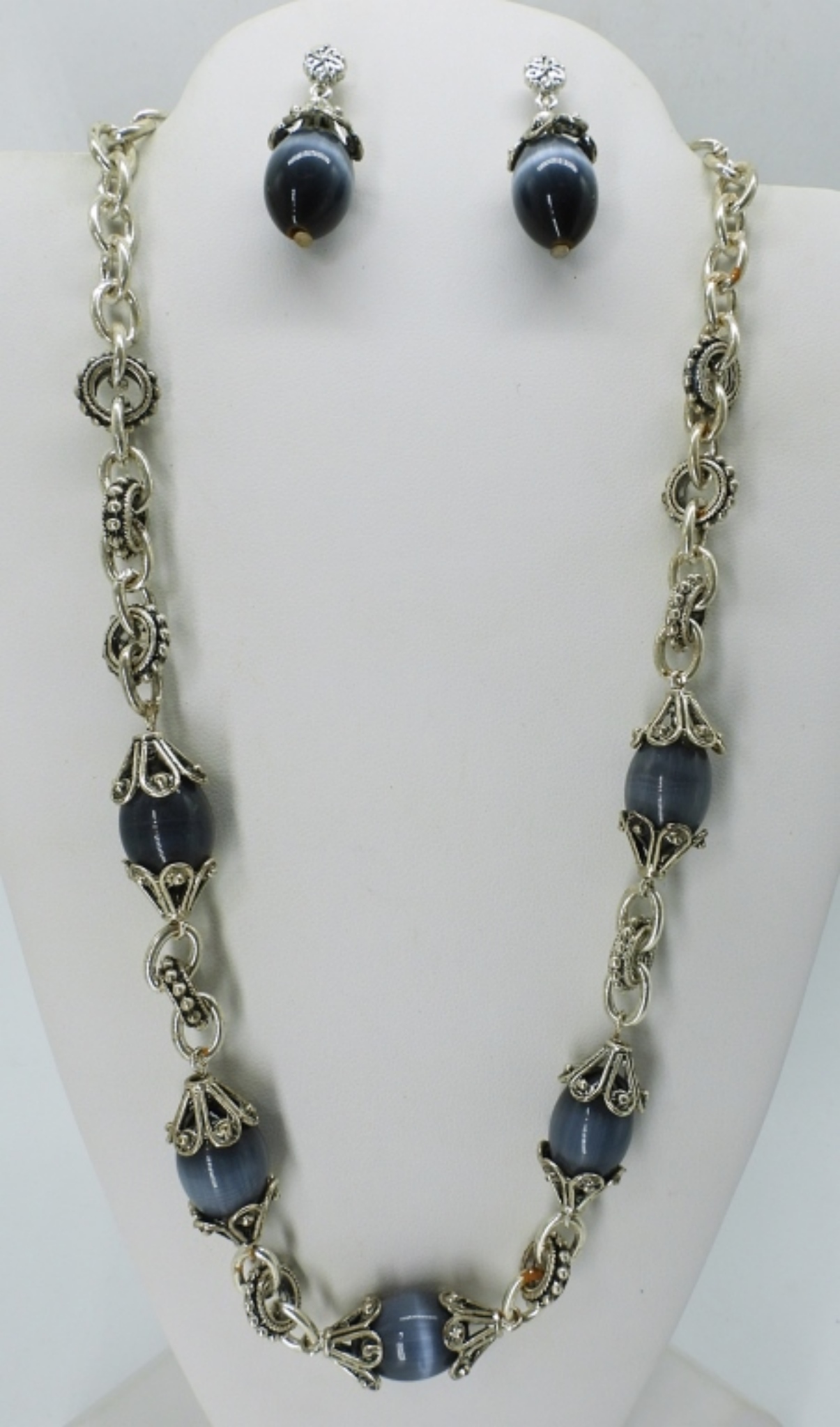 SILVER TONE BLUE CATS EYE NECKLACE & EARRING SET. 3 OTHER NECKLACES. 18″-20″.