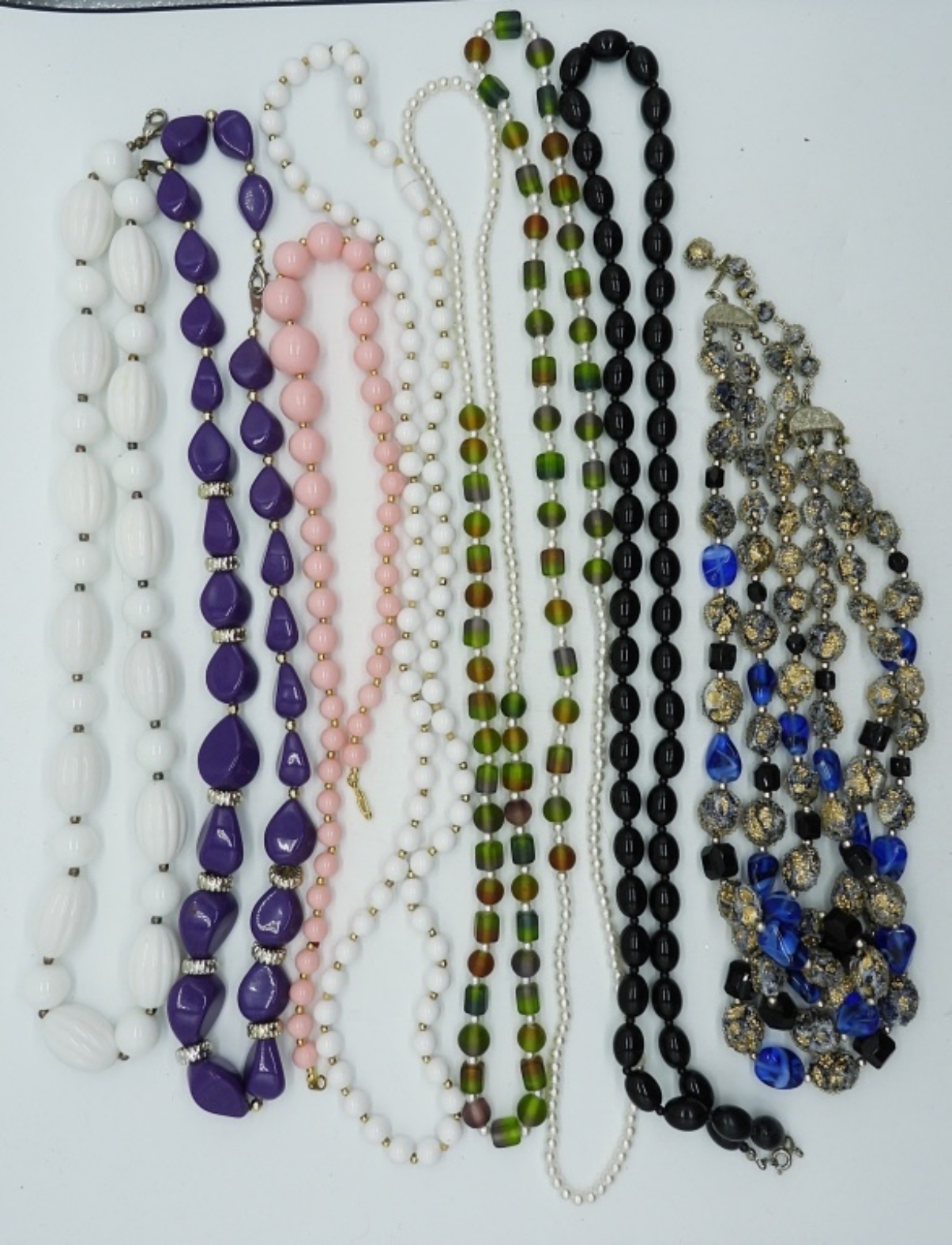 EIGHT VINTAGE PLASTIC BEADED NECKLACES. 18″-30″.