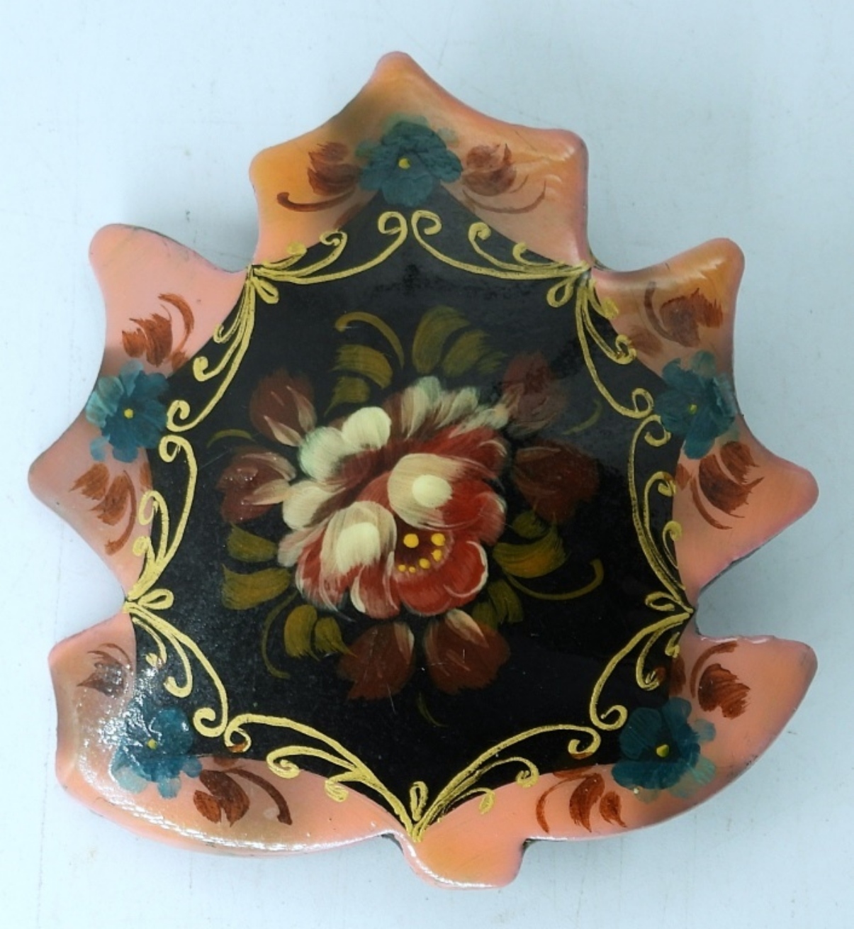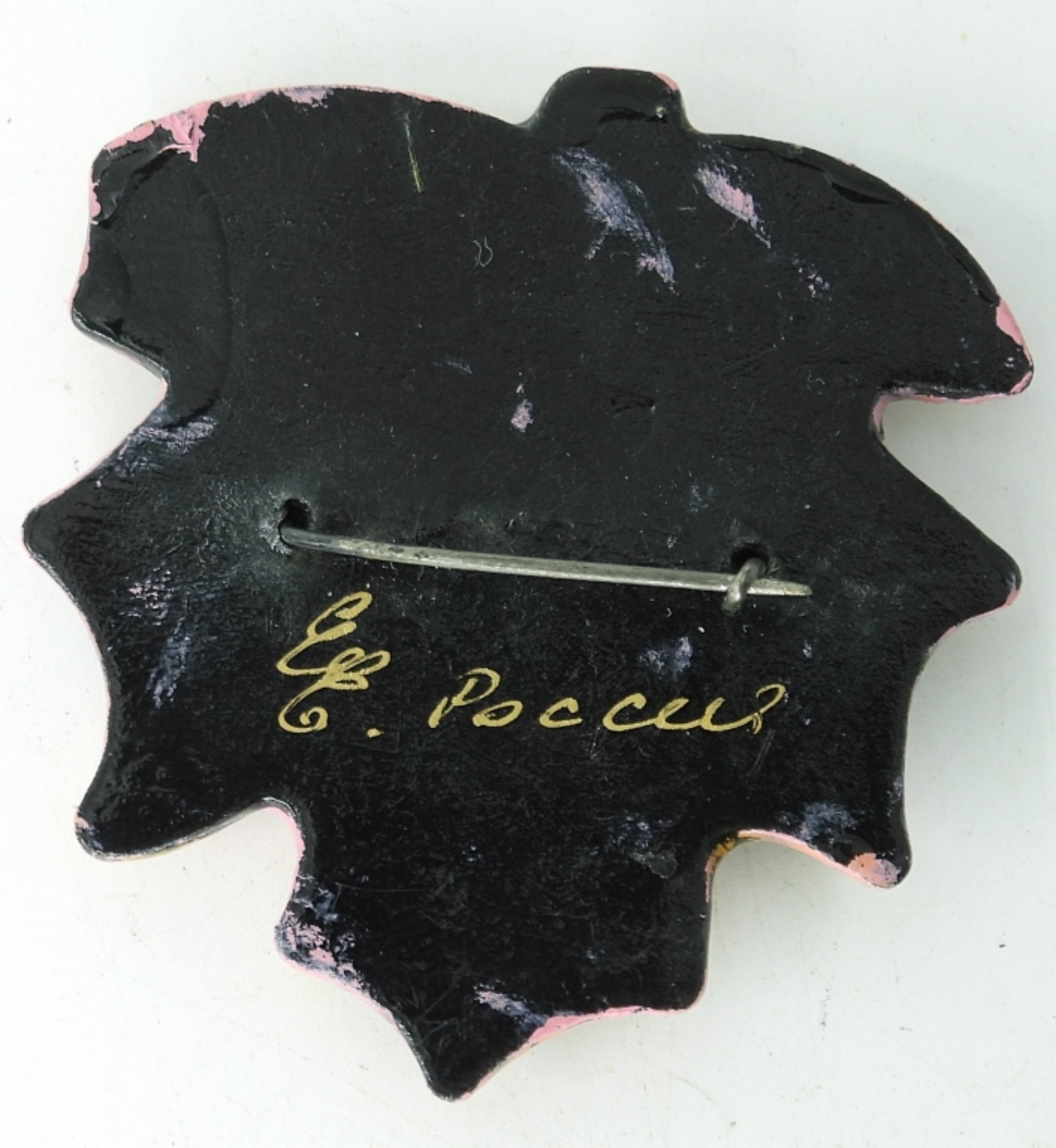 MAPLE LEAF SHAPE, RUSSIAN PAINTED BROOCH, SIGNED. 2″.