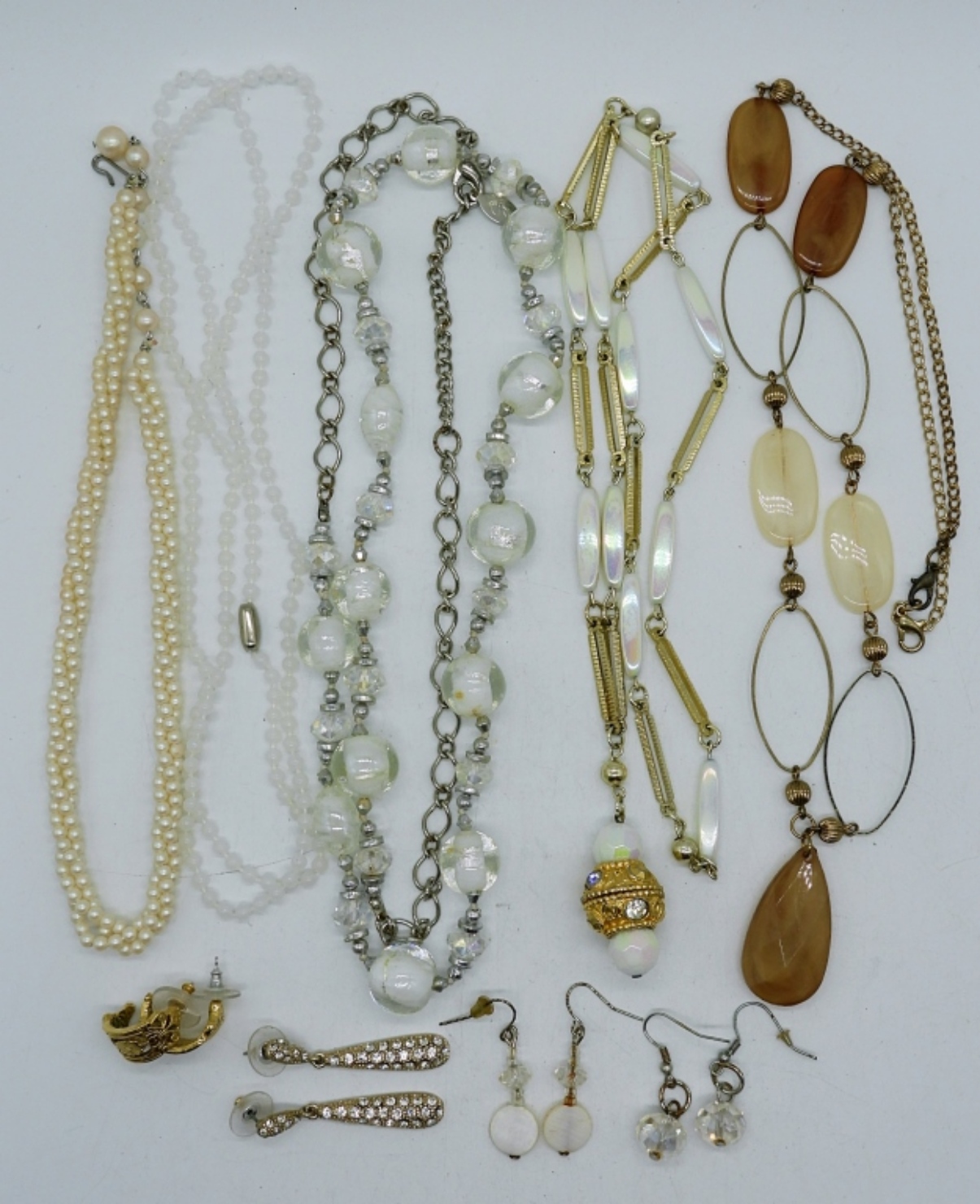 5 NECKLACES, 16-36″. 4 PAIR EARRINGS