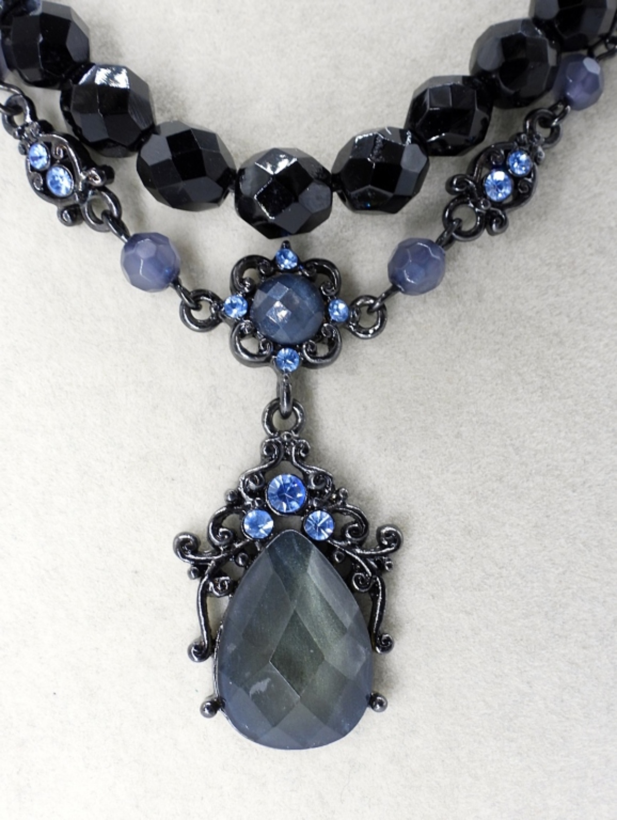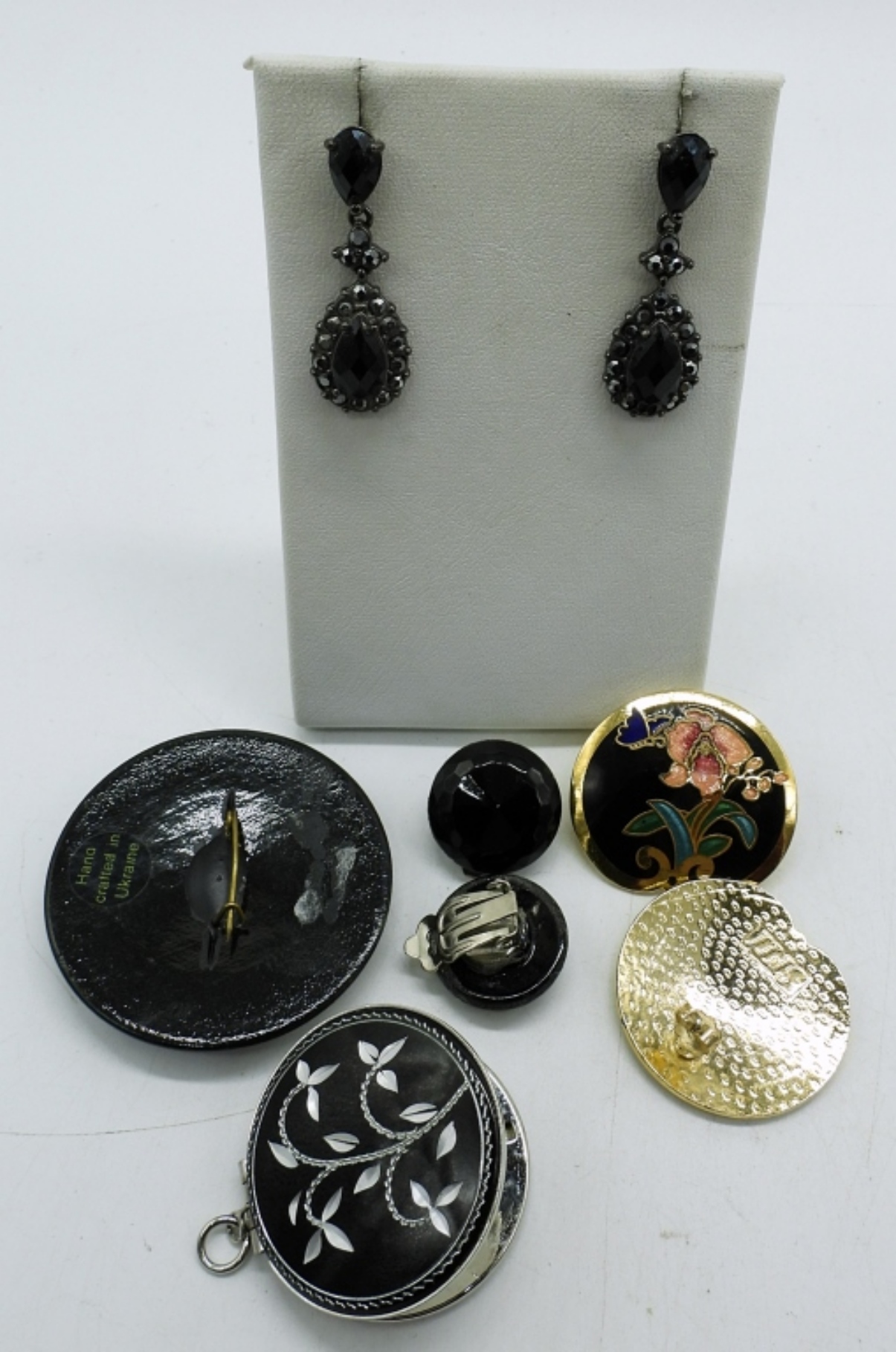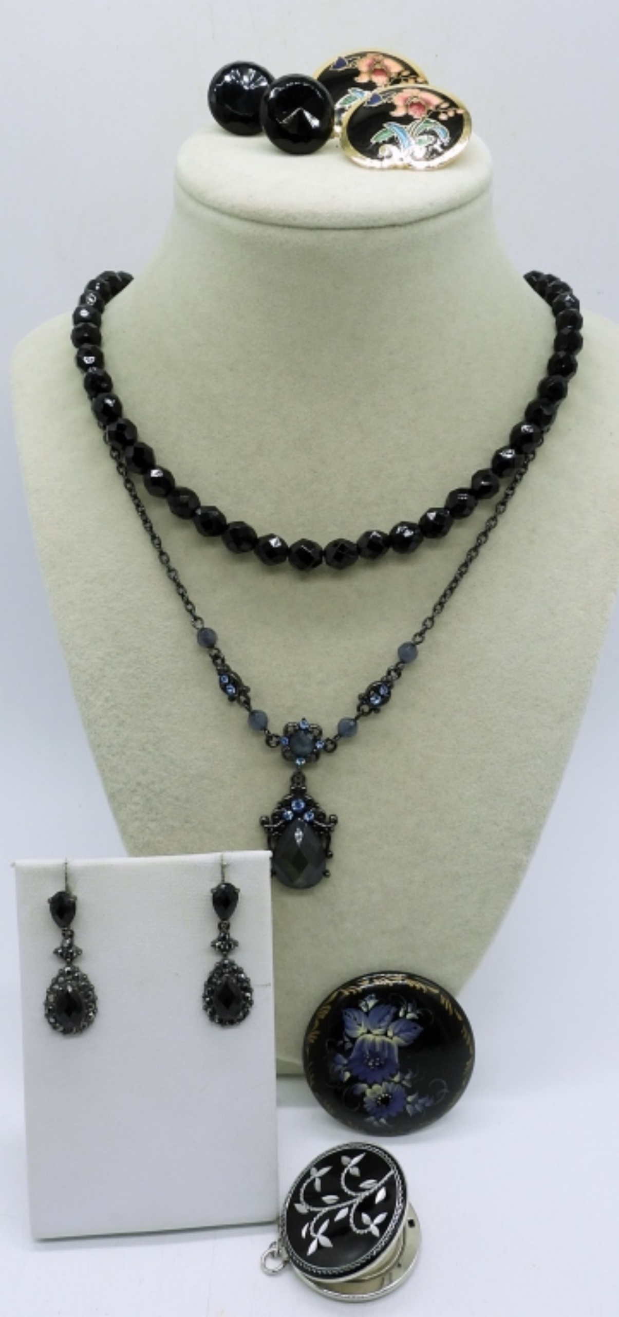 NECKLACES ARE 16″ & 18″. 3 PAIR EARRINGS PIERCED & CLIP ON. BROOCH AND LOCKET PENDANT.