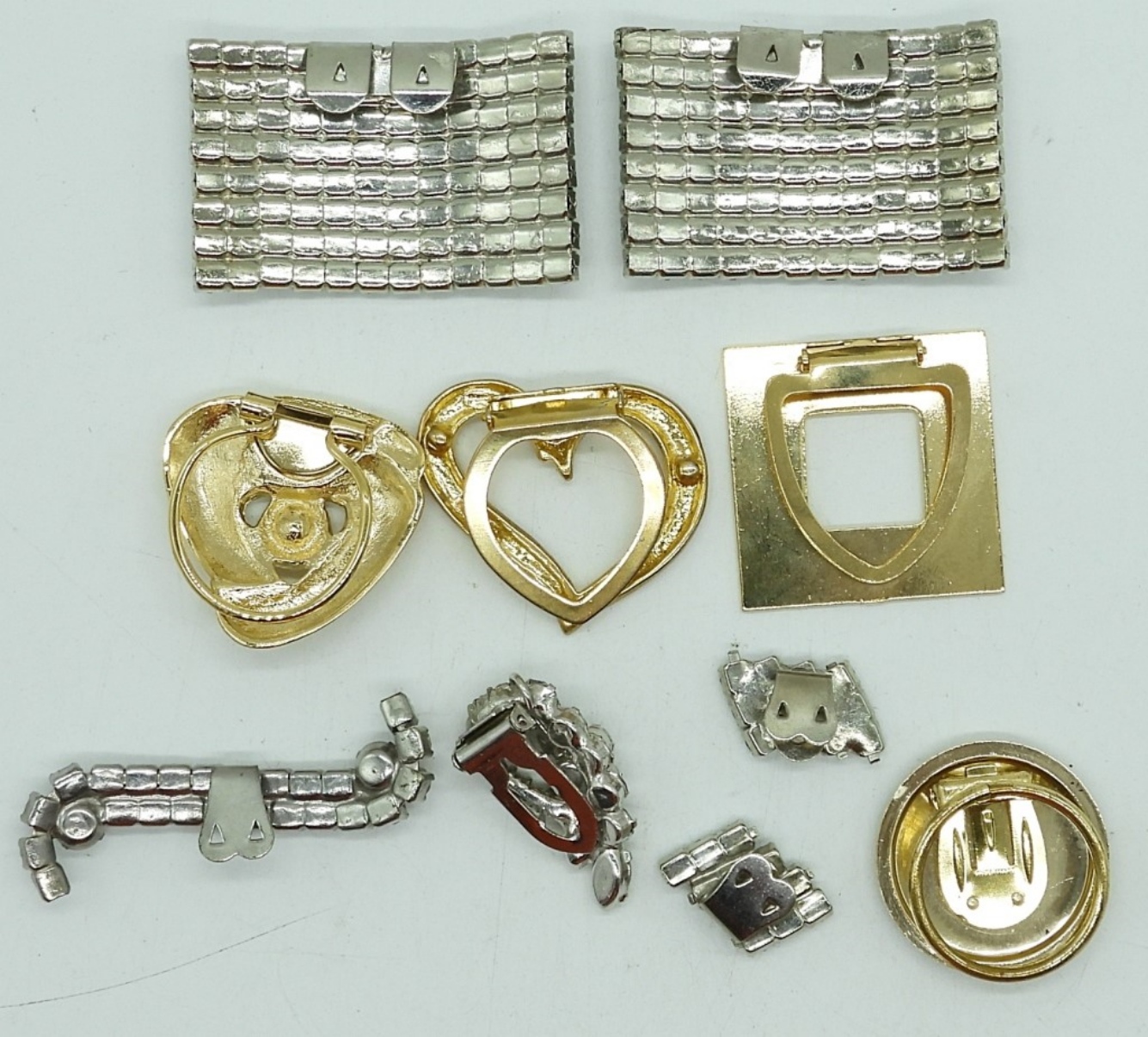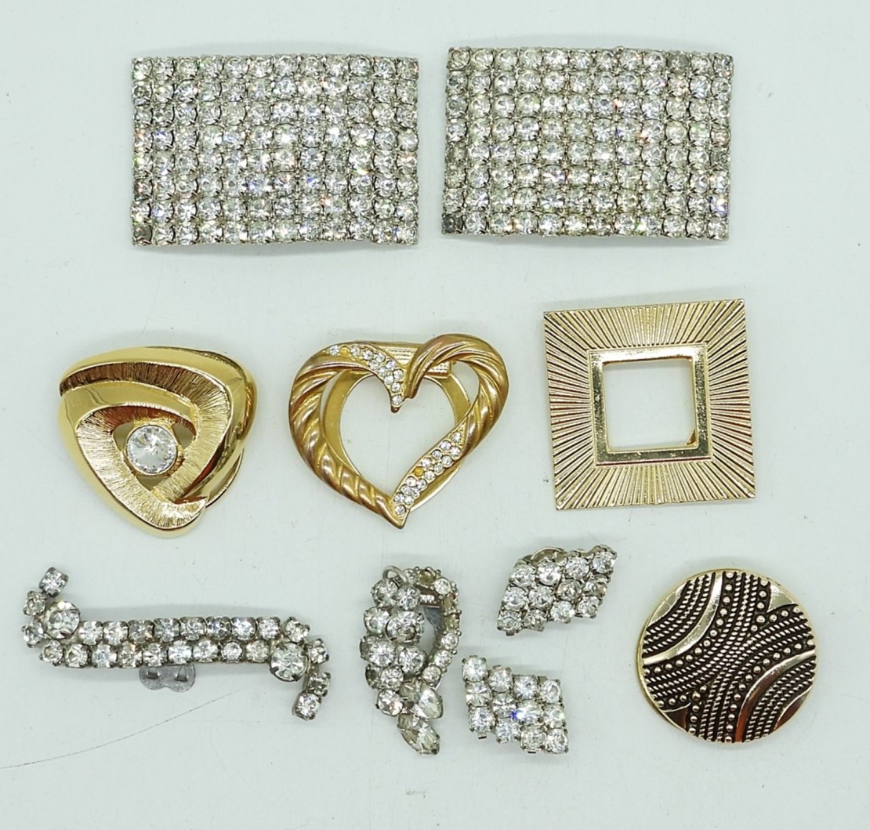 6 VINTAGE SILVER TONE SHOE CLIPS WITH RHINESTONES. 4 GOLD TONE SCARF CLIPS.