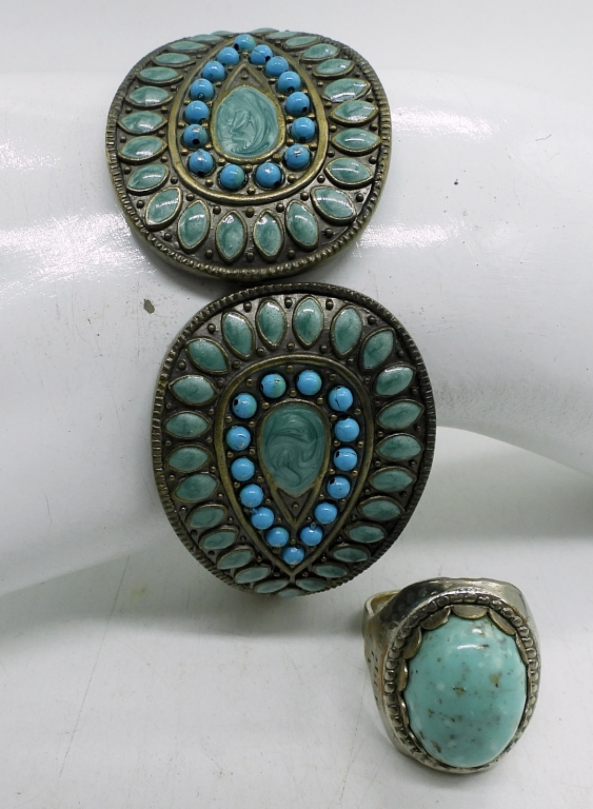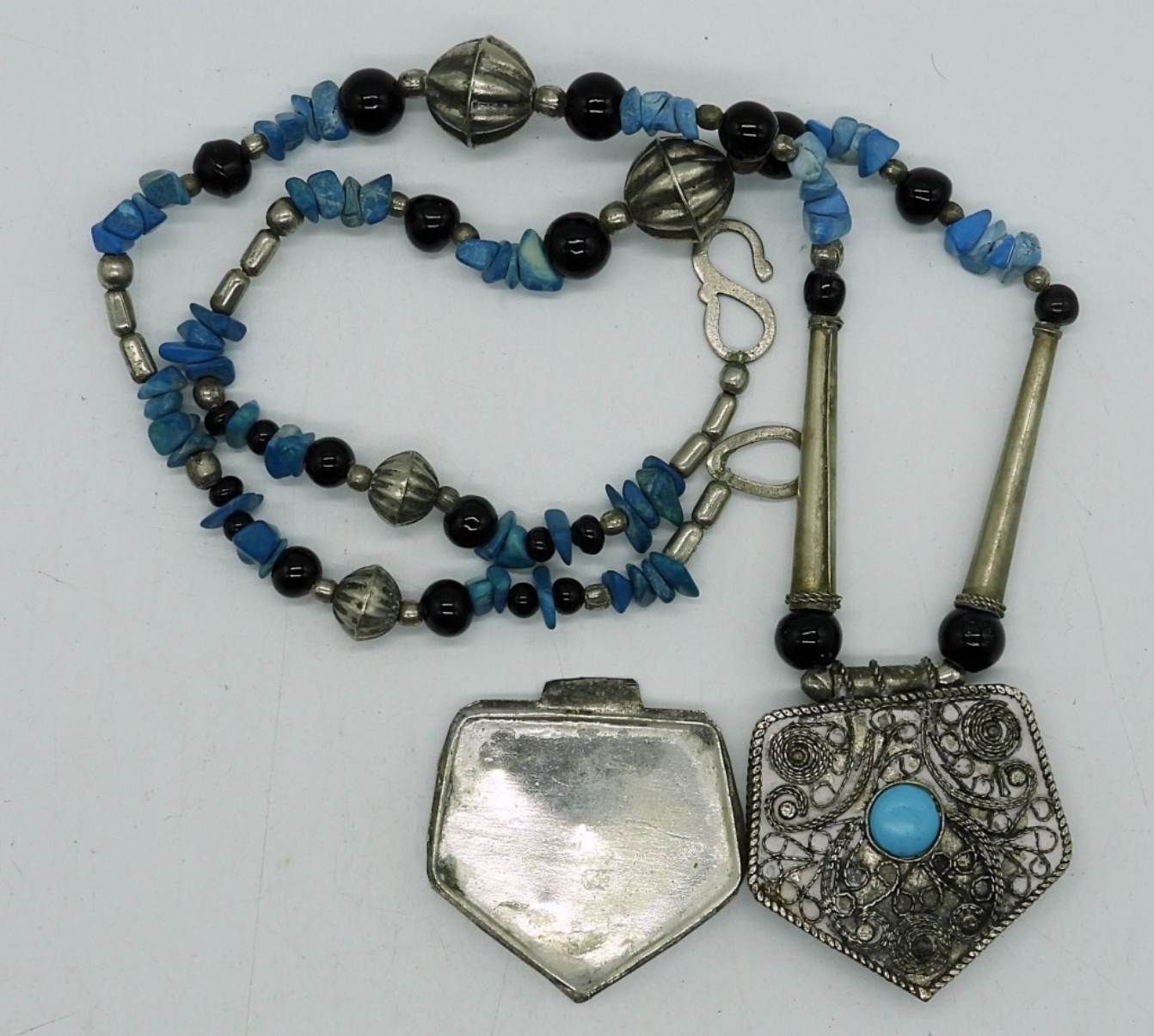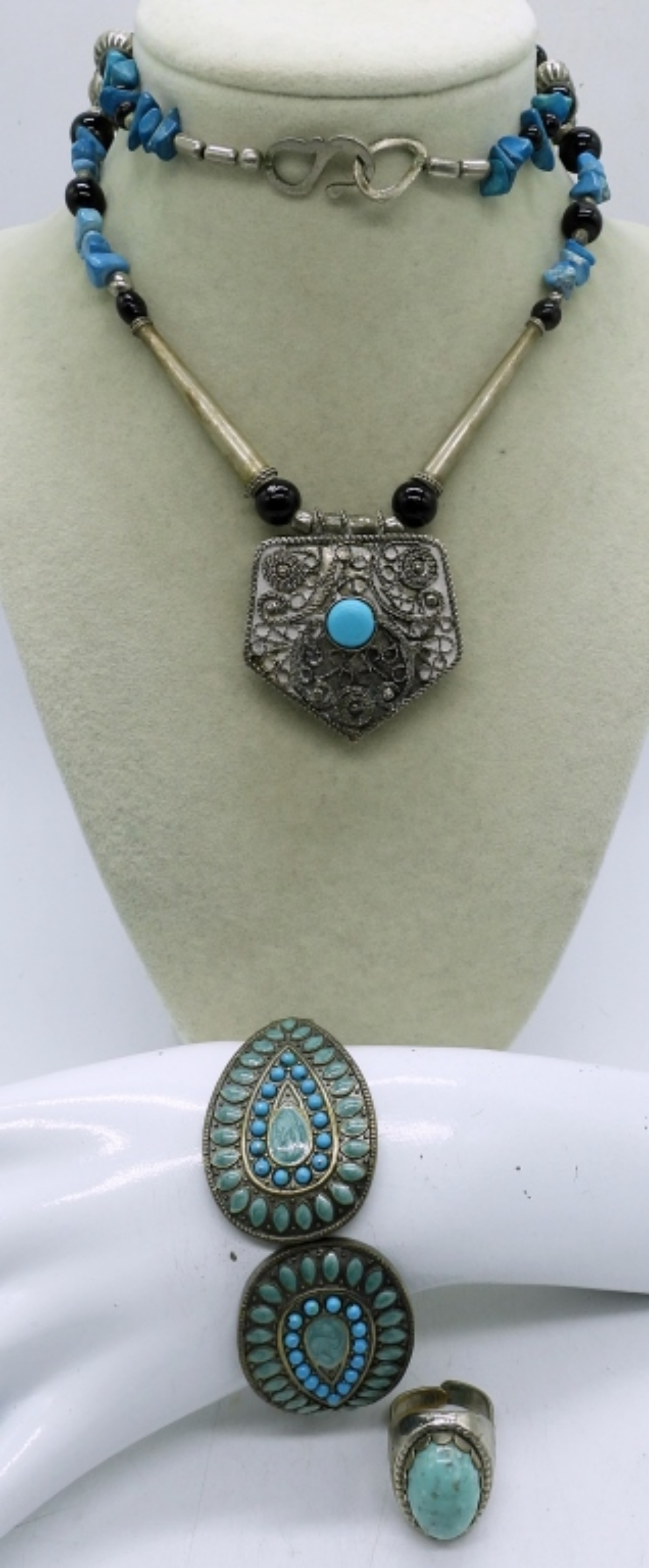 3 PIECE LADIES FAUX TURQUOISE SET, 26″ SILVER TONE TRINKET BOX NECKLACE WITH BLUE STONES, 3″ FAUX TURQUOISE SILVER TONE HINGE BANGLE BRACELET AND A SIZE 7 RING WITH SILVER TONE AND A TURQUOISE LIKE STONE