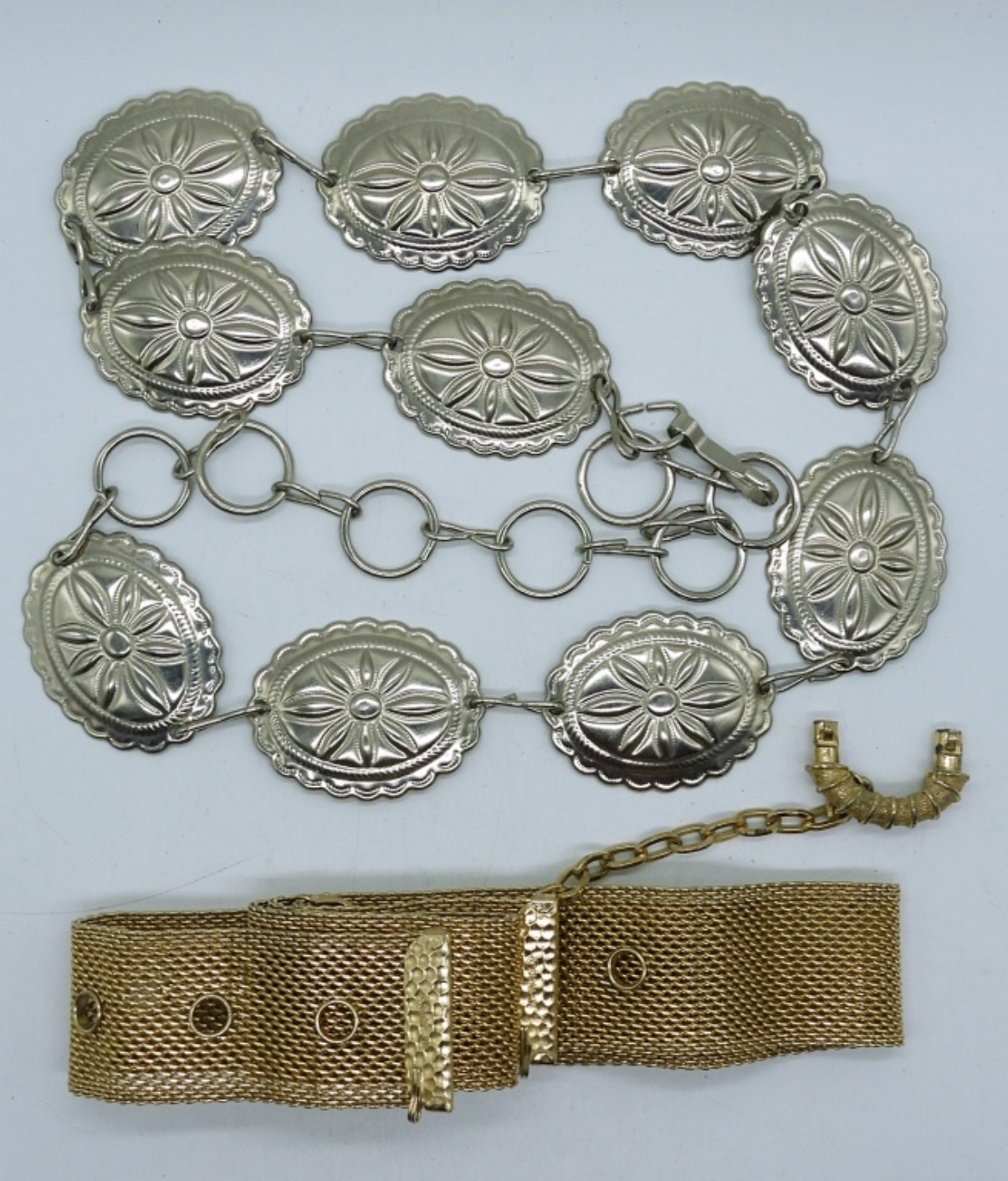 LADIES 36 ‘ SILVER TONE VINTAGE BELT AND 34″ GOLD TONE FASHION BELT