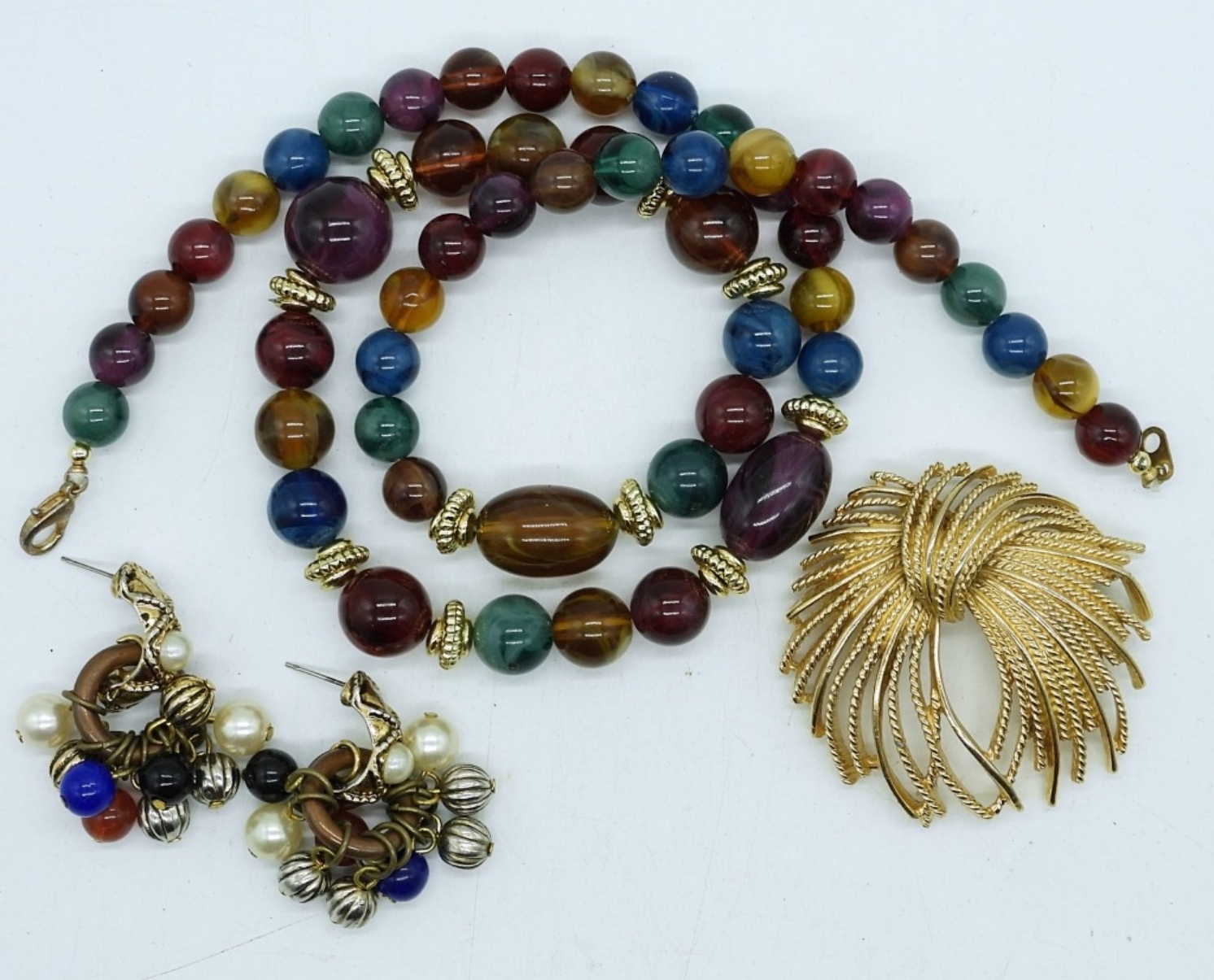 LADIES MULTI COLOR BEAD NECKLACE SET,24′ MULTI COLOR BEAD AND GOLD TONE NECKLACE, A PAIR OF GOLD TONE MULTI COLOR EARRINGS AND A GOLD TONE BROOCH