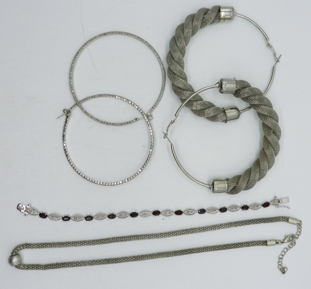 18″ SILVER TONE NECKLACE,3.5″ SILVER TONE BRACELET WITH RED STONES AND 2 PAIR OF LARGE SILVER TONE HOOP EARRINGS