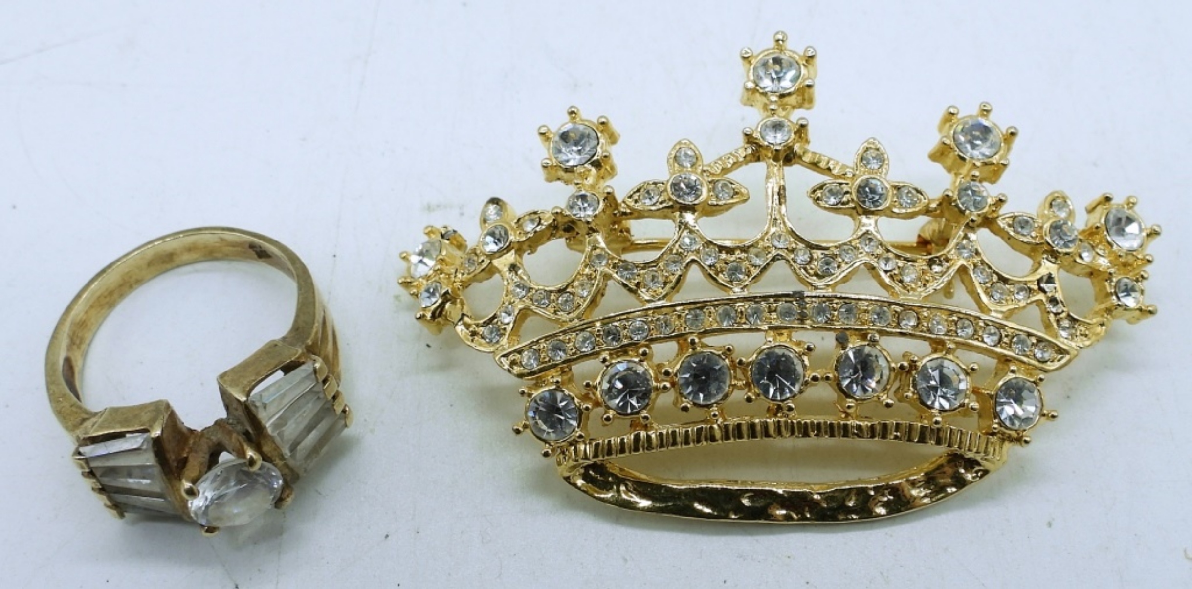 4 PIECE GOLD TONE TEEN JEWELRY LOT,16″ GOLD TONE INFINITY NECKLACE WITH DIAMOND LIKE STONES , A GOLD TONE CROWN PIN WITH DIAMOND LIKE STONES AND PAIR OF GOLD TONE DOLPHIN EARRINGS AND A SIZE E 6.5 GOLD TONE RIND WITH
