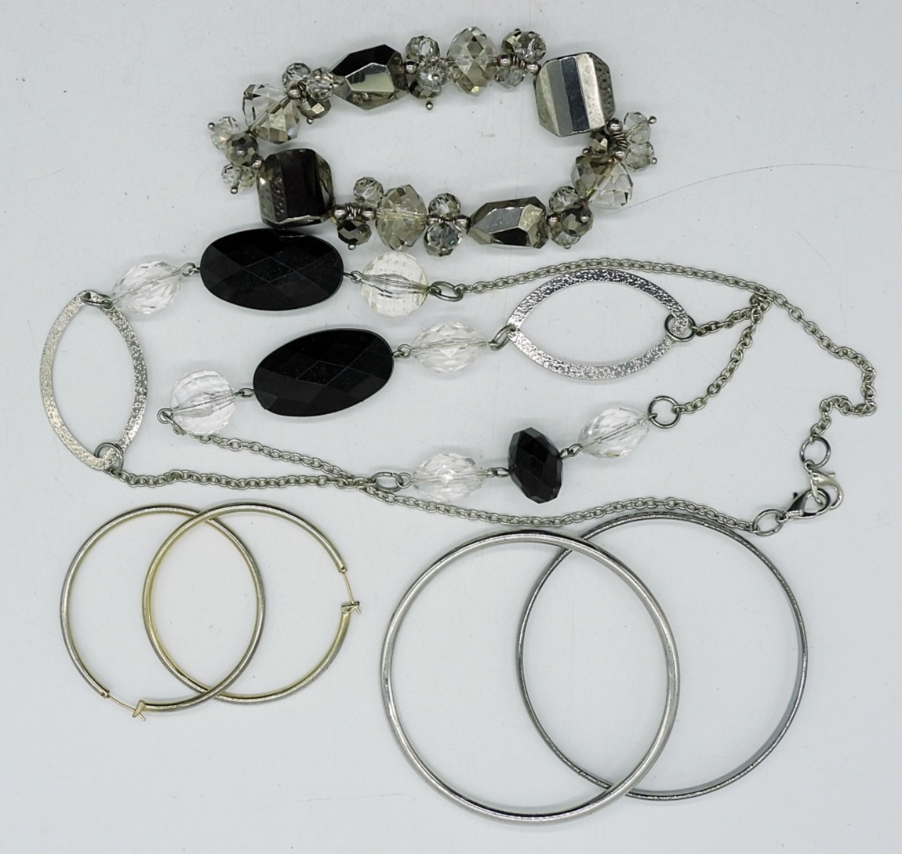 5 PIECE LADIES FASHION JEWELRY SET,32″ SILVER TONE NECKLACE WITH BLACK AND CLEAR STONES, A PAIR OF SILVER TONE HOOP EARRINGS, 2 BANGLE SILVER TONE BRACELETS AND A SHINY BEAD SILVER TONE STRETCHY BRACELET