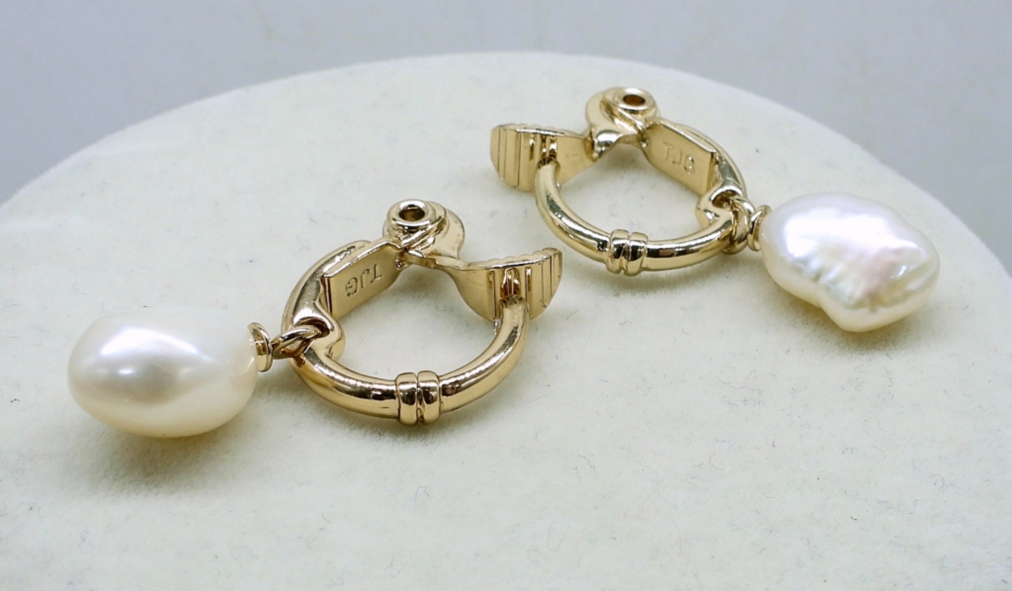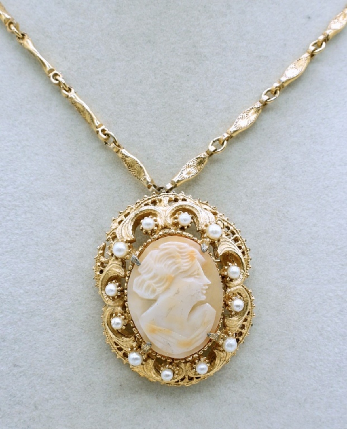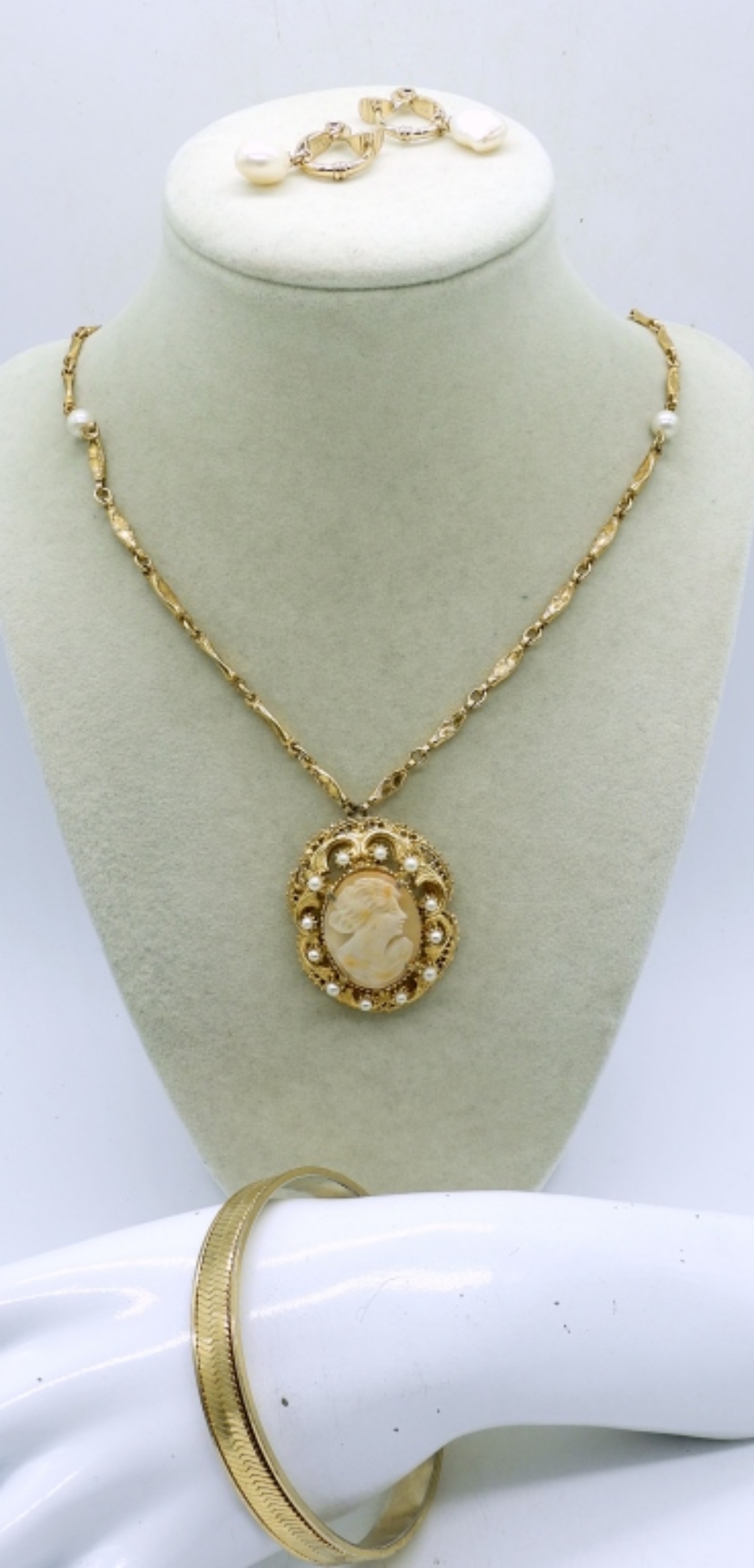 VTG 24″ FLORENZA GOLD TONE CAMEO PENDANT/BROOCH NECKLACE ,3′ GOLD TONE BANGLE BRACELET AND A PAIR OF GOLD AND PEAL EARRINGS