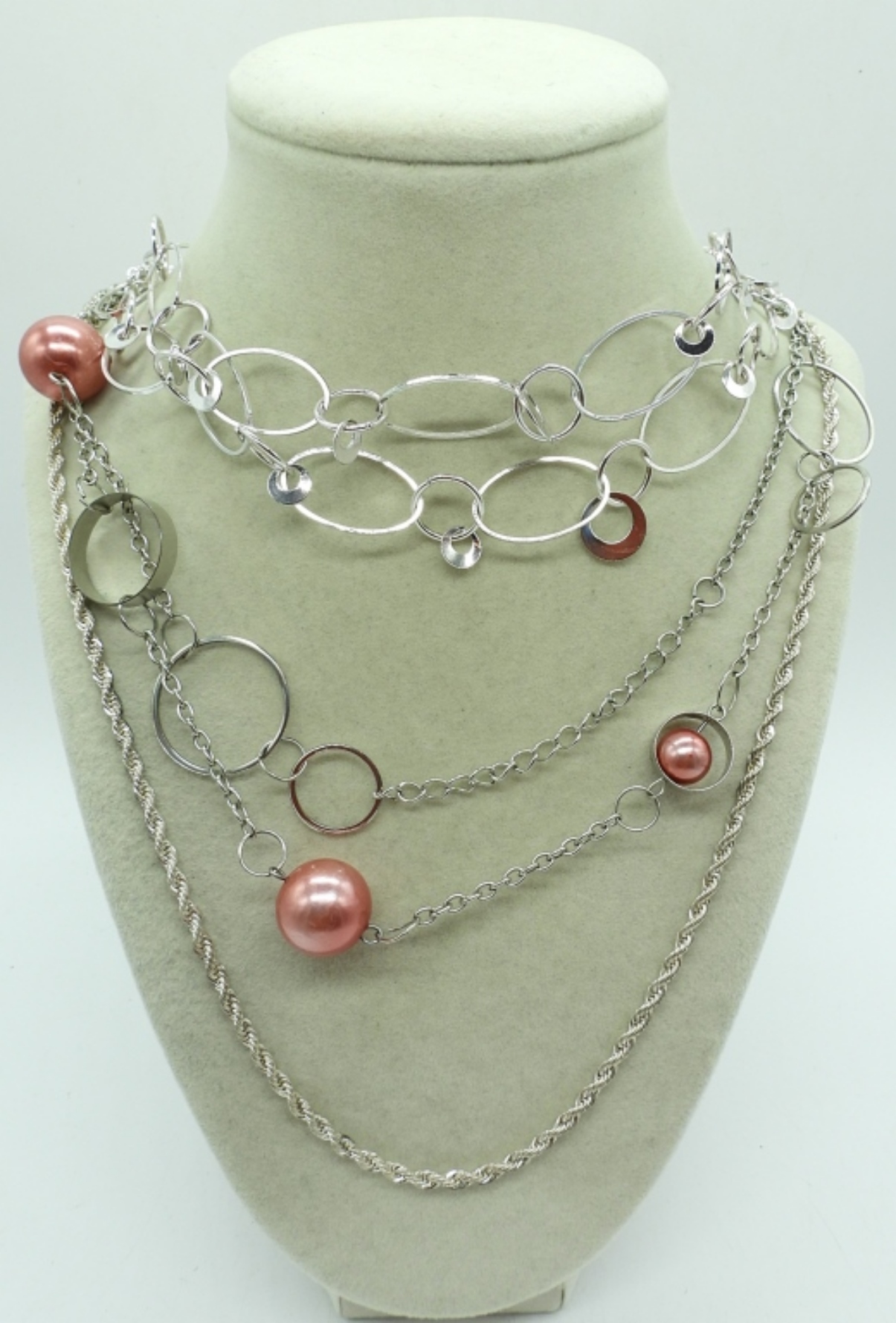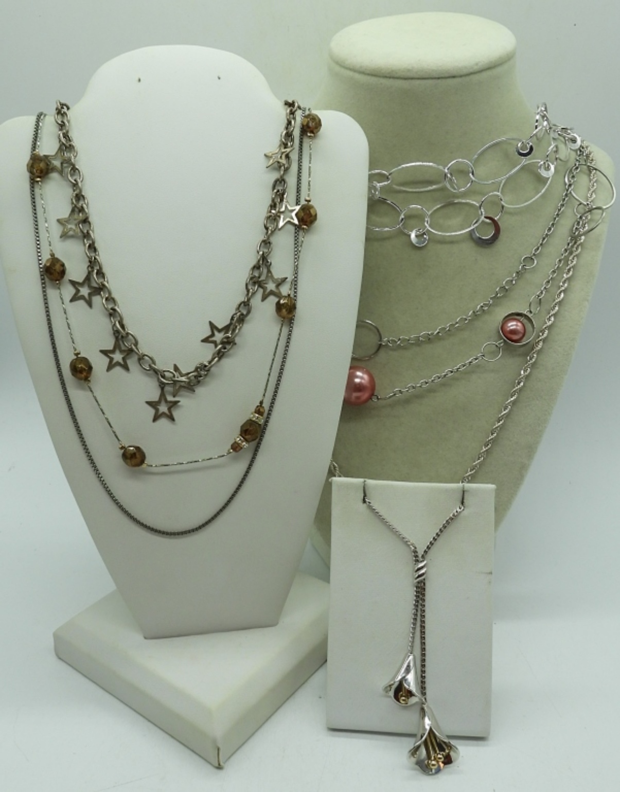 SEVEN MODERN SILVER TONE FASHION NECKLACES. 18″-36″.