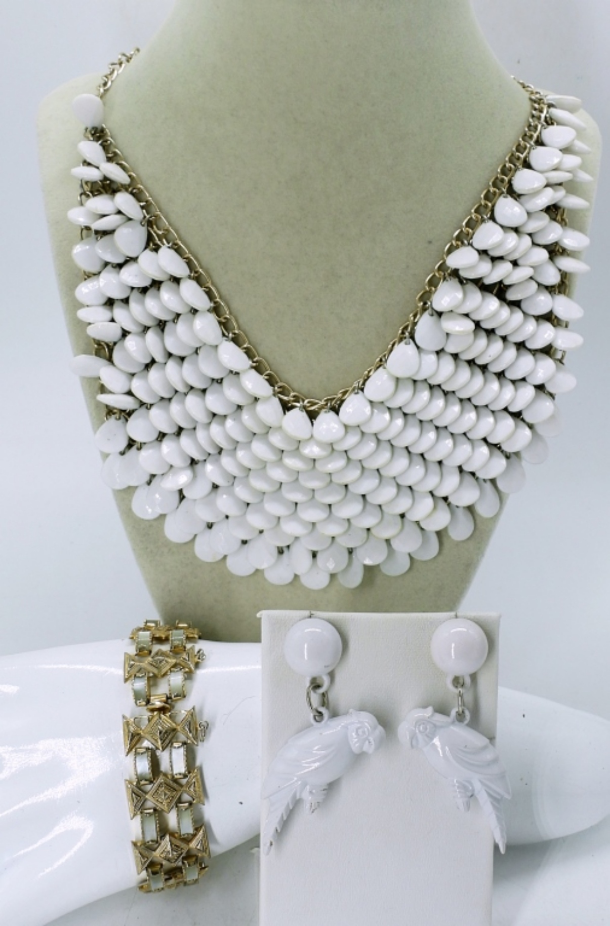 WOMENS 3 PIECE WHITE & GOLD TONE SET, 18″ WHITE TEAR DOP GOLD TONE CHAIN NECKLACE, 3.5″ GOLD TONE FAUX MOTHER OF PEARL LINK BRACELET AND A PAIR OF WHITE PAREKEET EARRINGS