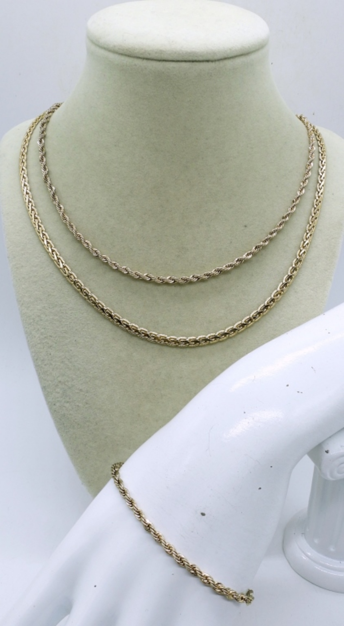 LADIES 3 PIECE GOLD TONE FASHION SET, (2) GOLD TONE NECKLACES 22′ & 18″ AND A 3″ GOLD TONE BRACELET