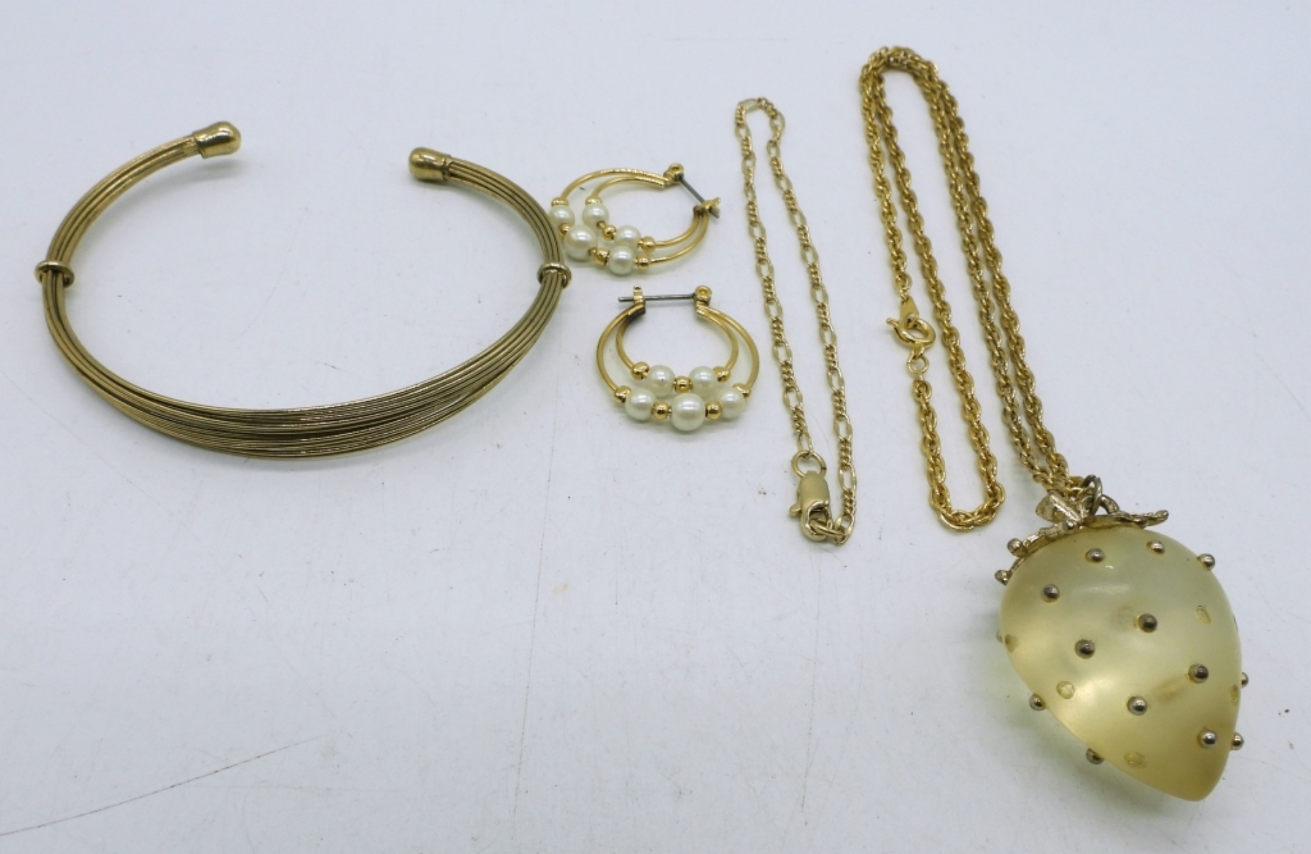 LADIES GOLD TONE FASHION SET, 18″ GOLD TONE NECKLACE WITH A STRAWBERRY PENDANT A GOLD TONE CUFF BRACELET, A 3″ GOLD TONE CLASP BRACELET AND A PAIR OF GOLD TONE PEARL EARRINGS