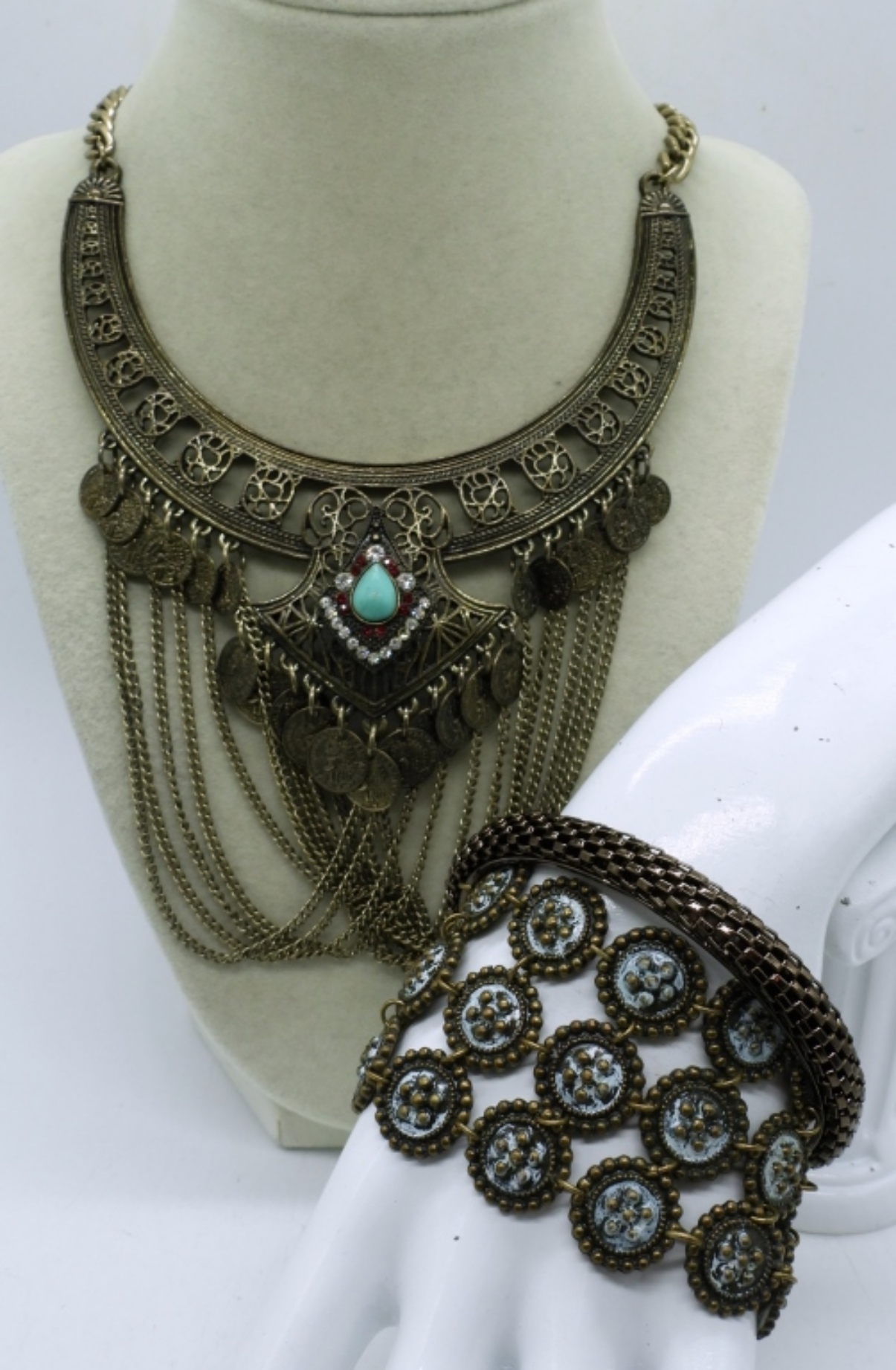 18 ‘ BRONZE FRINGE NECKLACE WITH A TURQUOISE LIKE STONE WITH RED AND CLEAR GEMS, 3’ BRONZE CLASP BRACELET AND A BRONZE BANGLE