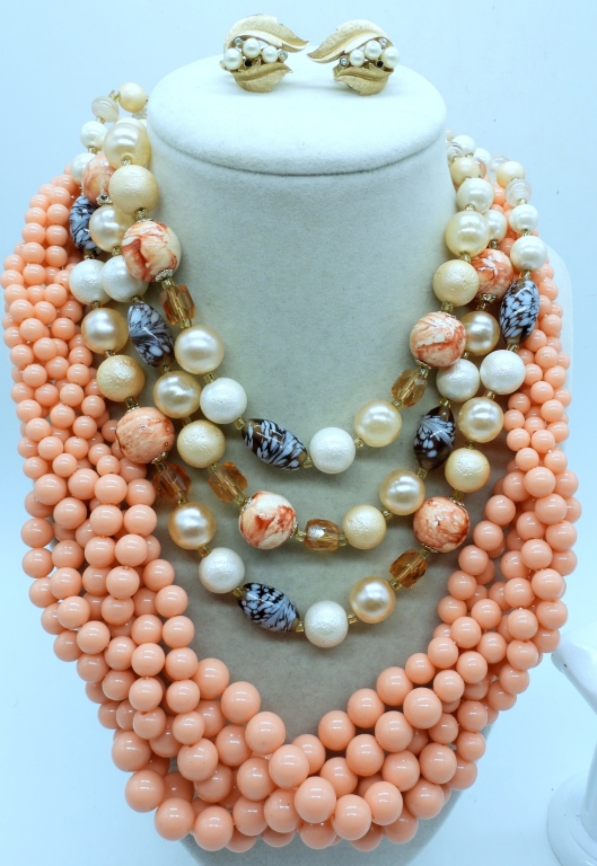 18′ CHUNKY LADIES CORAL BEADED NECKLACE ,18″ 3 STRAND MULTI COLOR BEADED NECKLACE AND A PAIR OF GOLD TONE TRIFARI CLIP ON EARRINGS