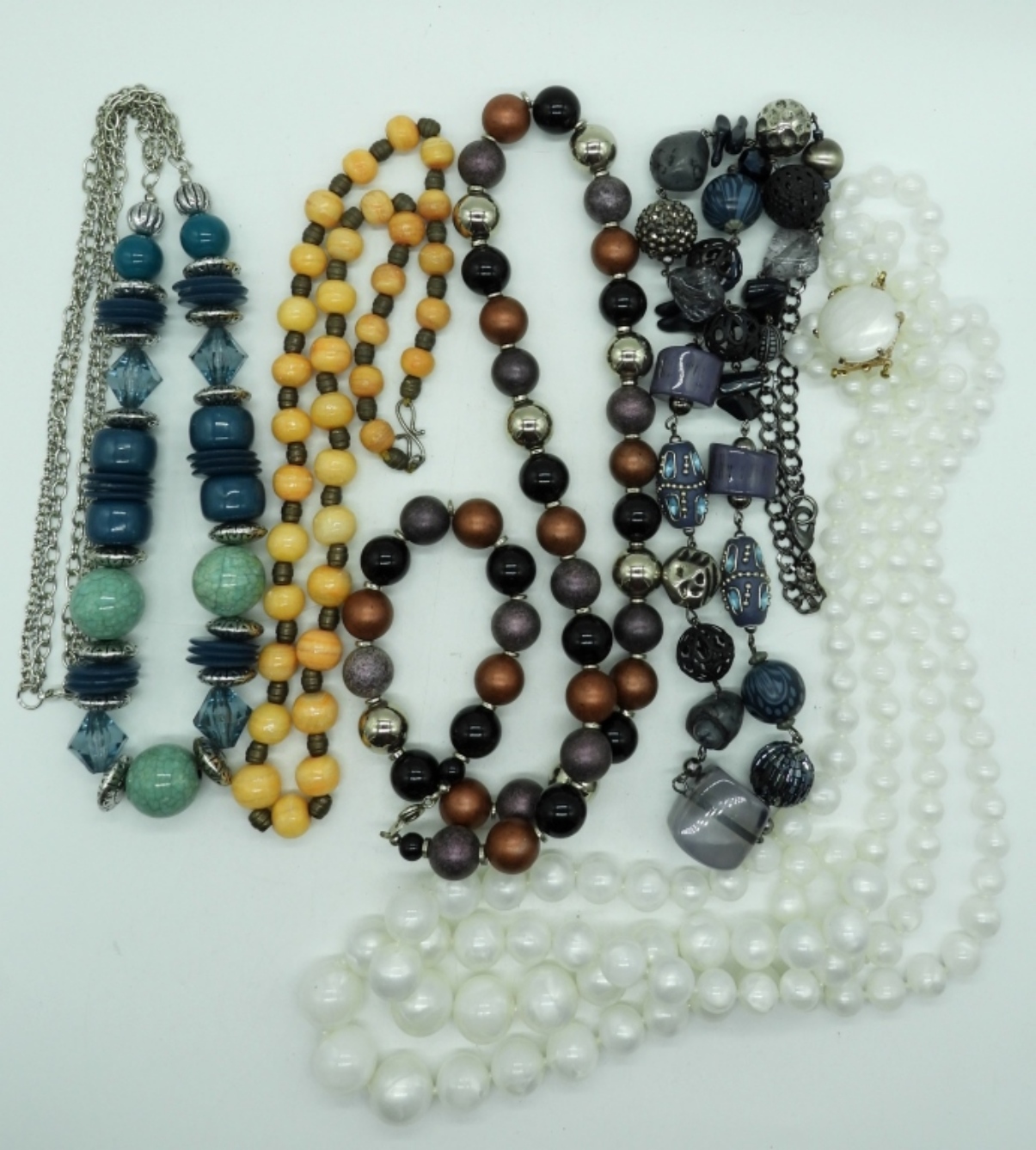 (5) LARGE BEADED NECKLACES,36″ DOUBLE STRAND WHITE BEAD NECKLACE, 36″ BLUE AND SILVER TONE BEADED NECKLACE,30″ SLIVER TONE AND BLUE NECKLACE,30″ MULTI COLOR BEADED NECKLACE, AND A 26″ PEACH AND GOLD TONE BEADED NECKLACE