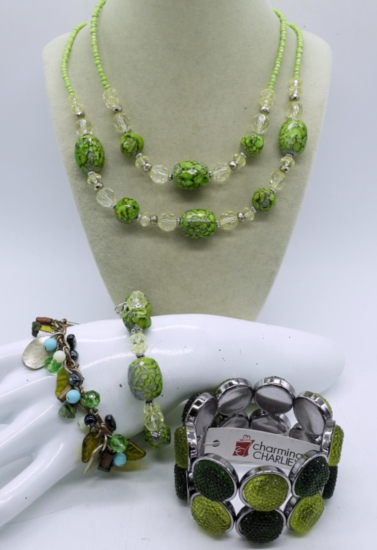 16″ DOUBLE STRAND GREEN BEADED NECKLACE WITH A MATCHING 3.5′ BRACELET’ GREEN GEM BRACELET AND A 3″ MULTI COLOR STONE AND BEAD BRACELET