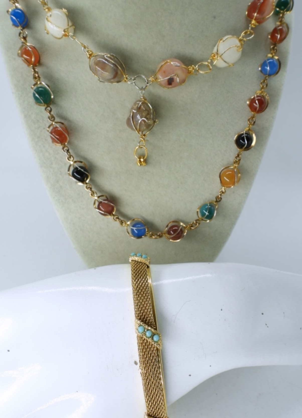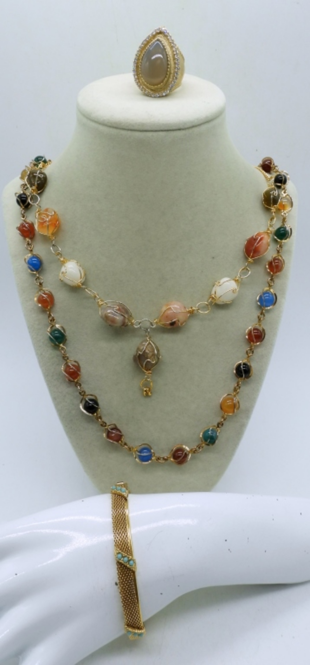 (4)PIECE NATURAL GEMSTONE NECKLACE& MORE, 2 GOLD TONE NATURAL GEMSTONE NECKLACES SIZE 20″ & 24′,2.5 CLASP GOLD TONE BRACELET AND A SIZE 10 GOLD TONE RING