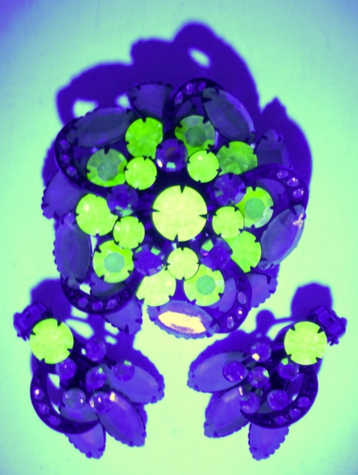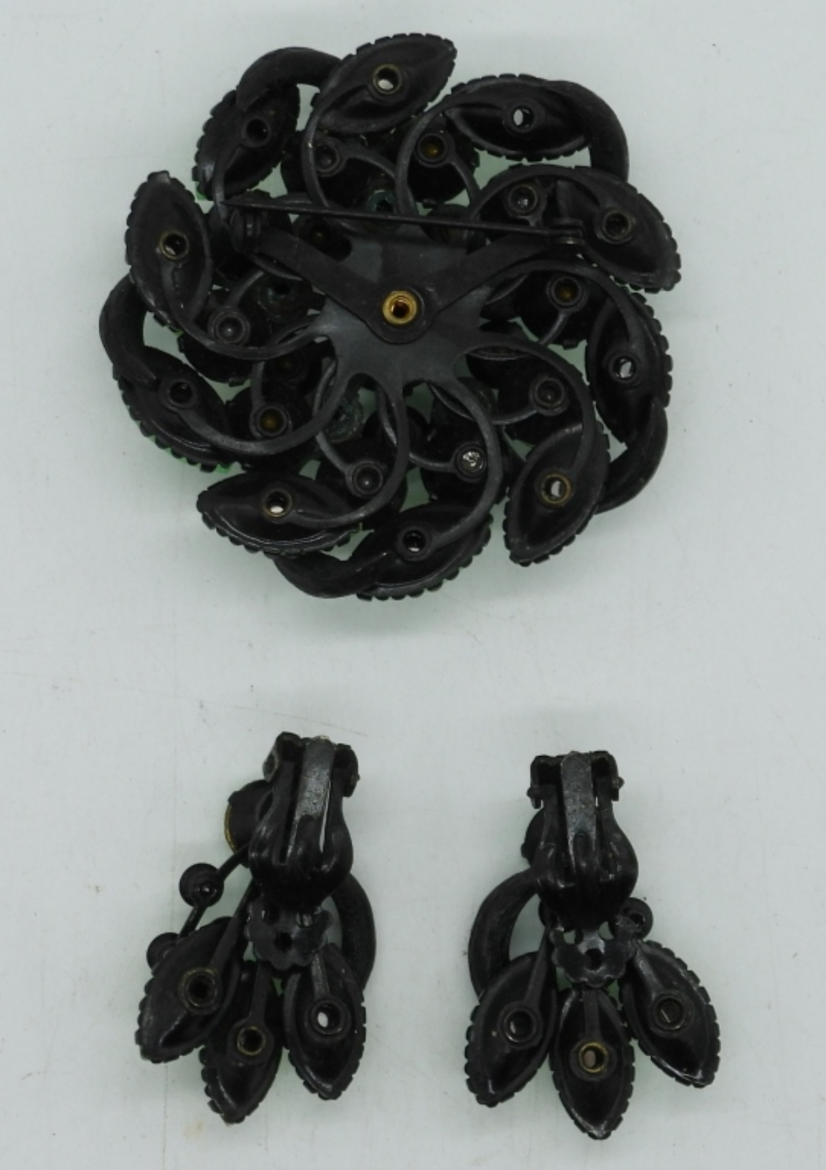 LARGE GREEN GLASS URANIUM BROOCH AND CLIP ON EARRINGS. BROOCH MEASURES 2.5″. EARRINGS ARE 1″.