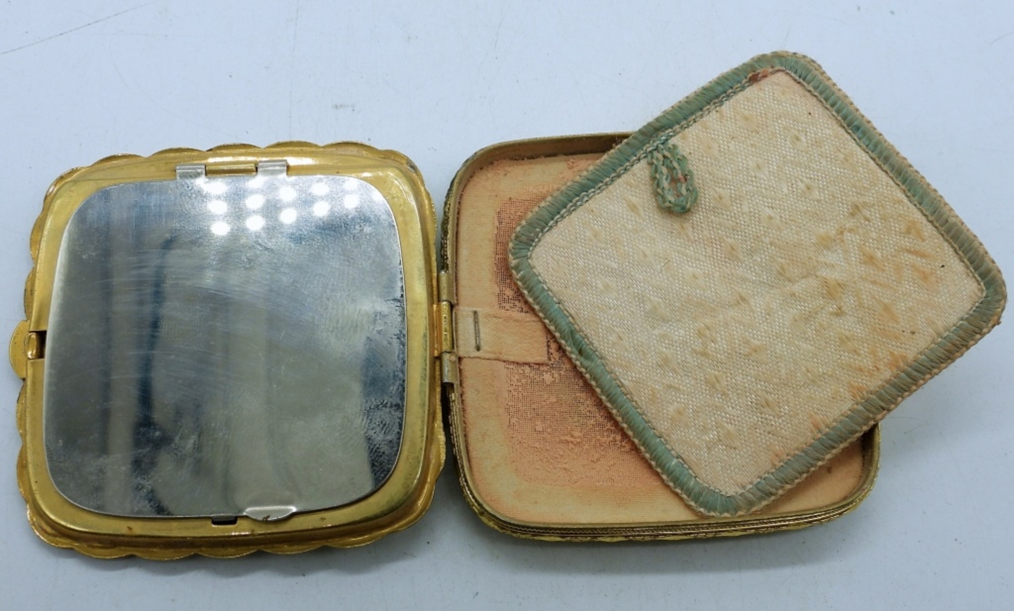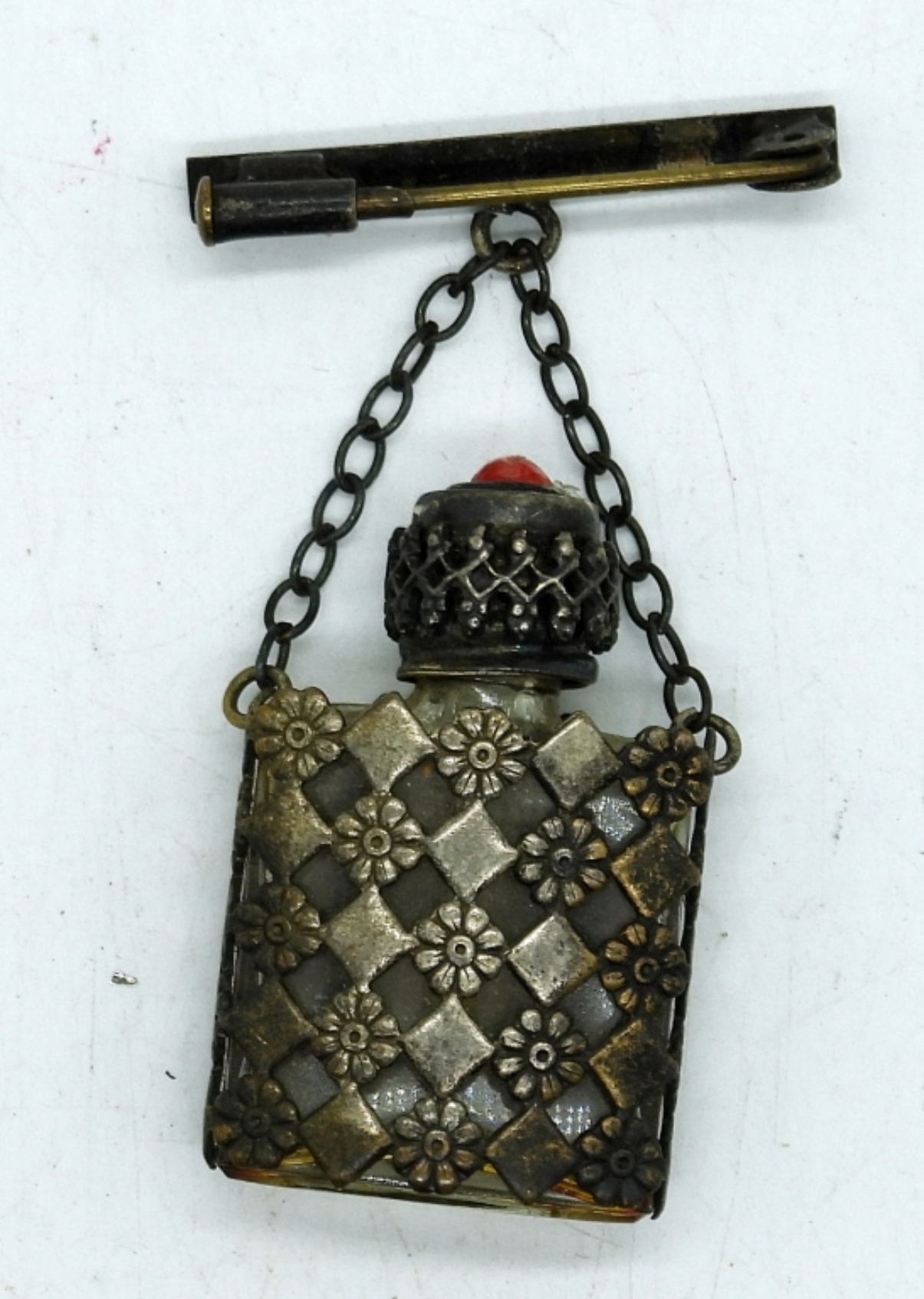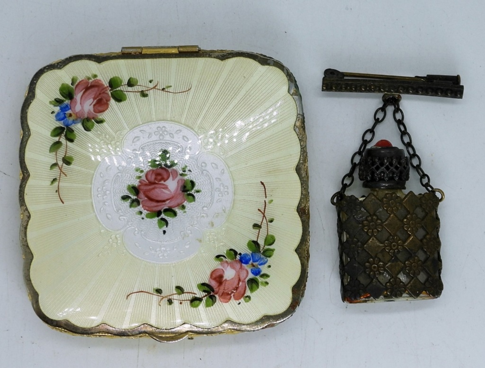 PRETTY VINTAGE MAKEUP COMPACT WITH MAKEUP STILL INSIDE, 2.5″. GLASS BOTTLE BROOCH, 2″ TALL.