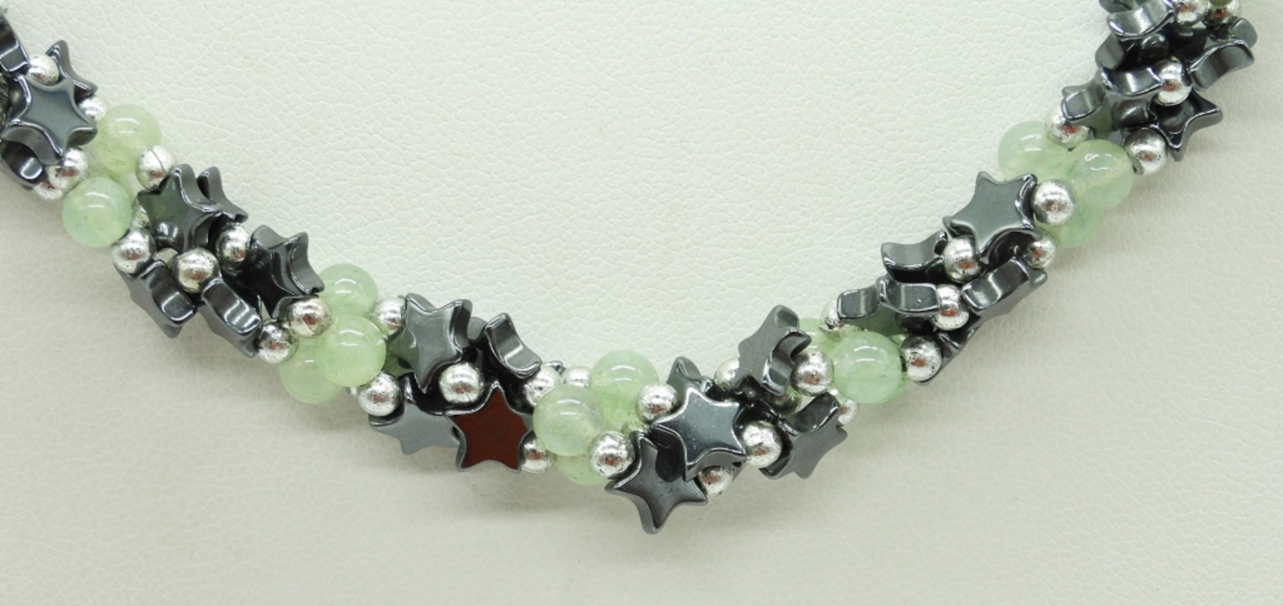 HEMATITE & JADE BEADED NECKLACE, 18″. BLACK PEARL STUD PIERCED EARRINGS.