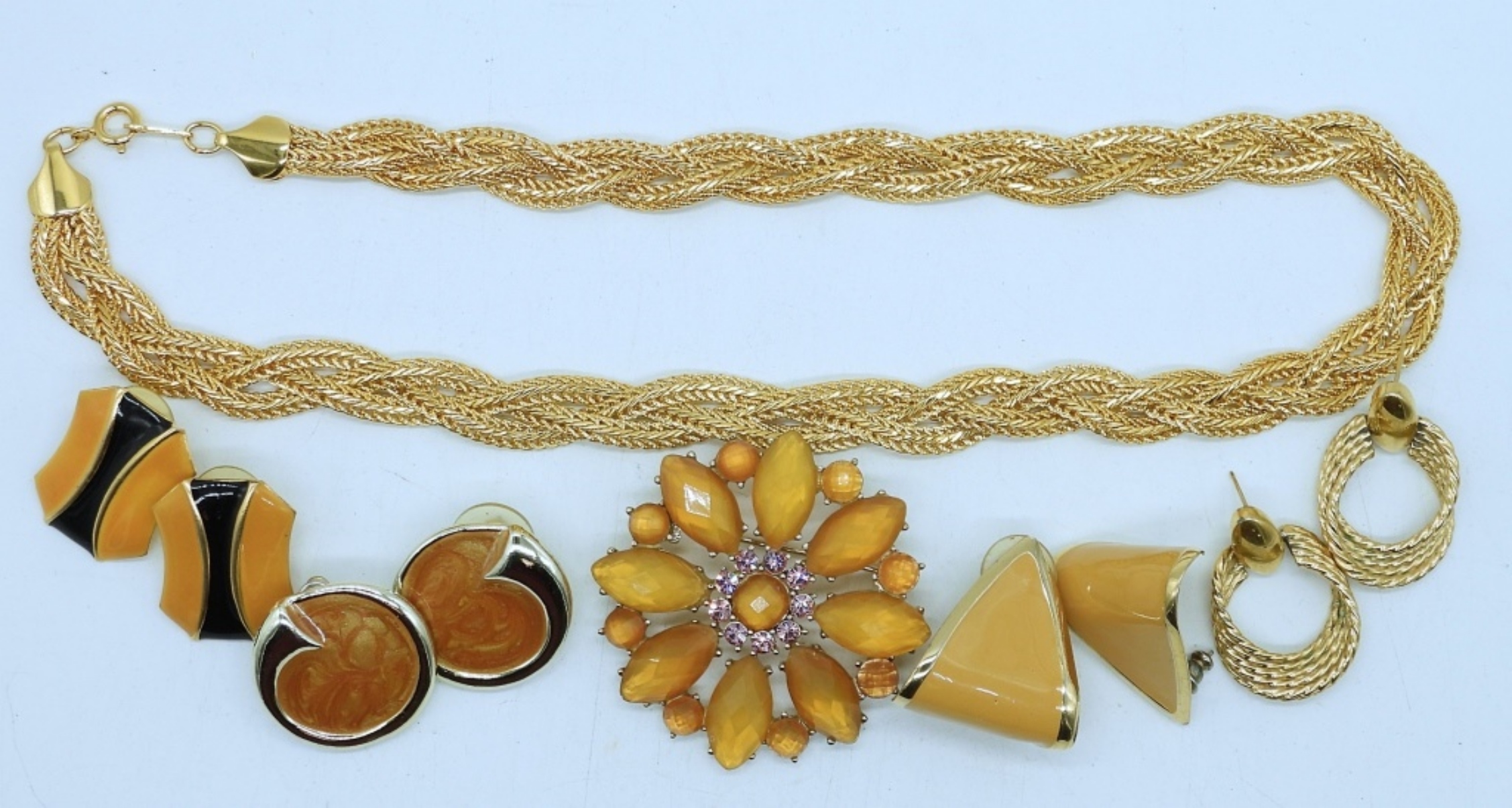 NECKLACE 17″. BROOCH 2″. 4 PAIR OF PIERCED EARRINGS