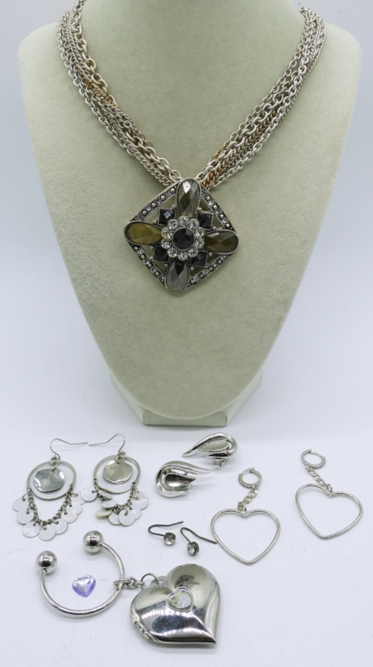 NECKLACE, 20″. LOCKET HEART KEYCHAIN. FOUR PAIR OF PIERCED EARRINGS.