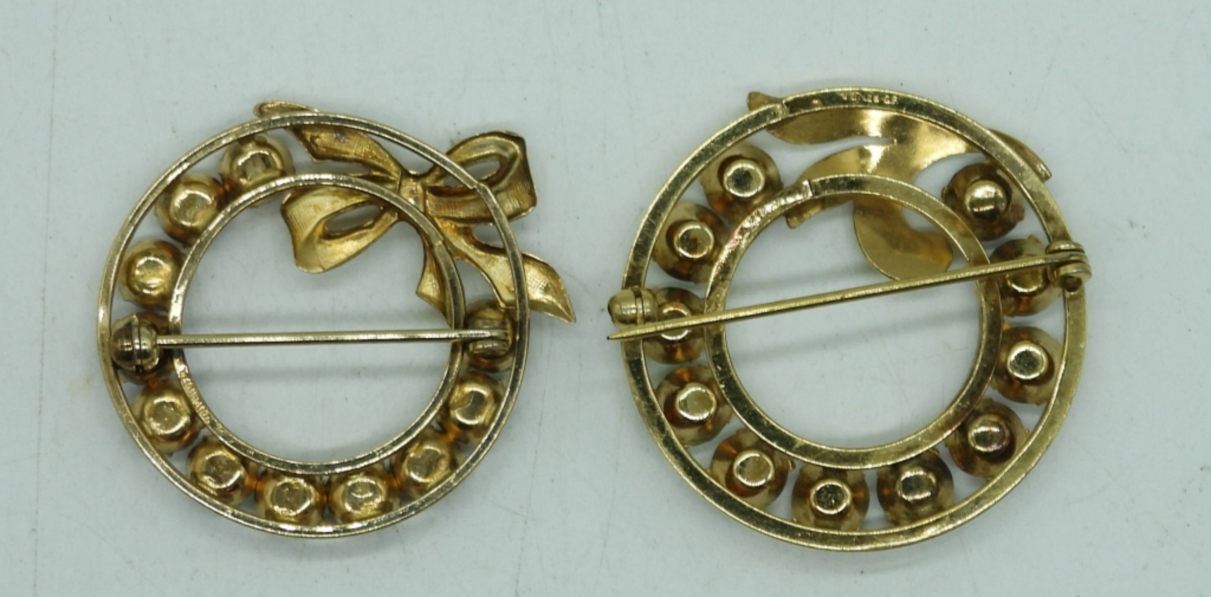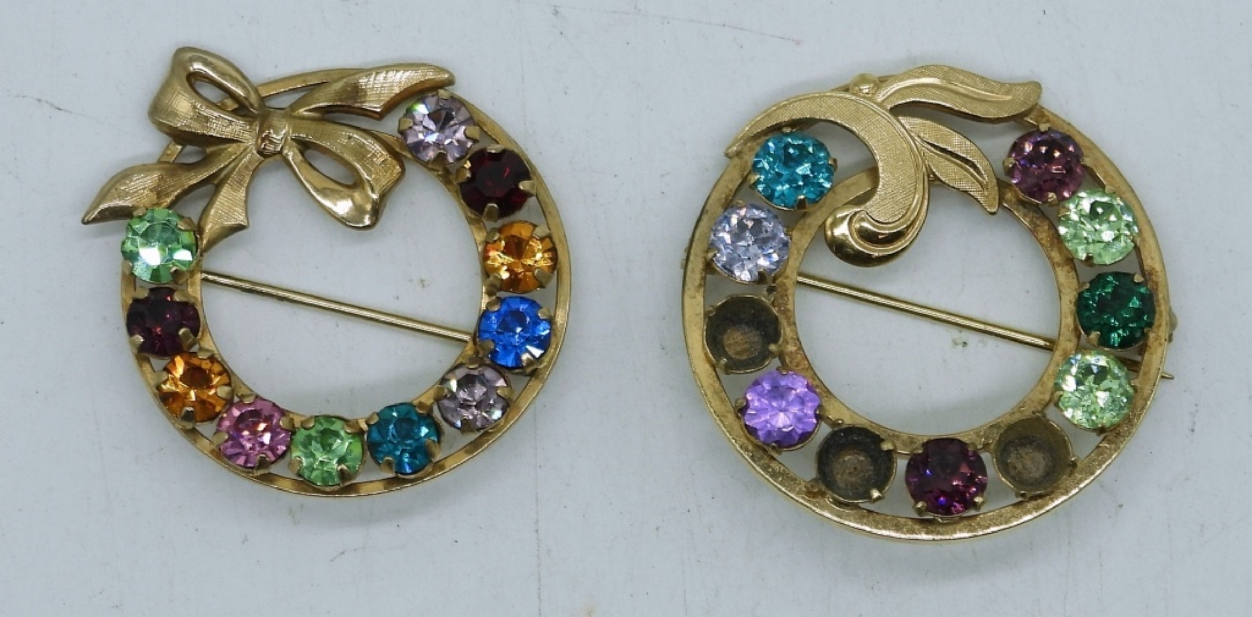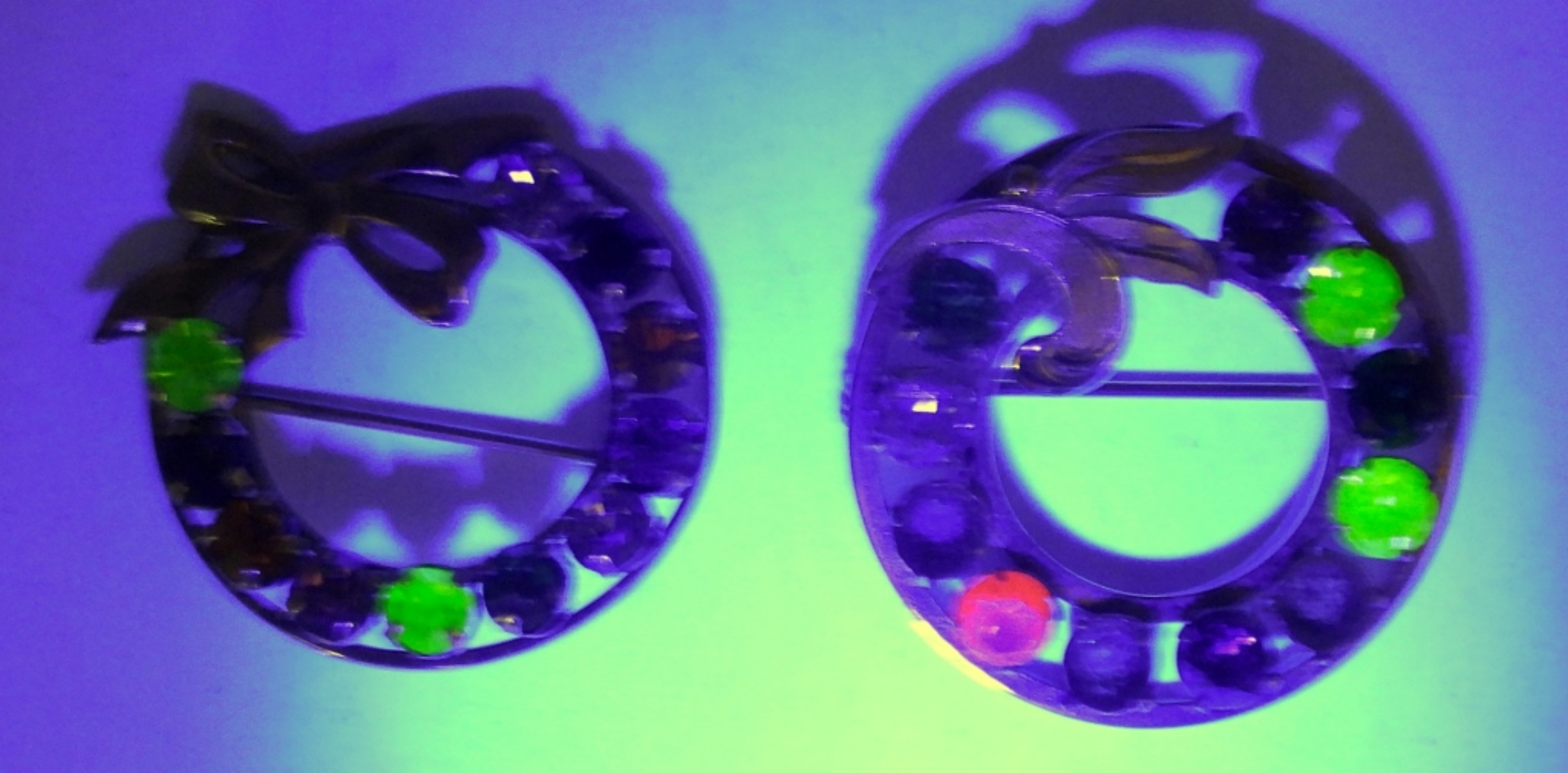 TWO VINTAGE GOLD TONE PINS WITH A FEW URANIUM GLASS RHINESTONES.