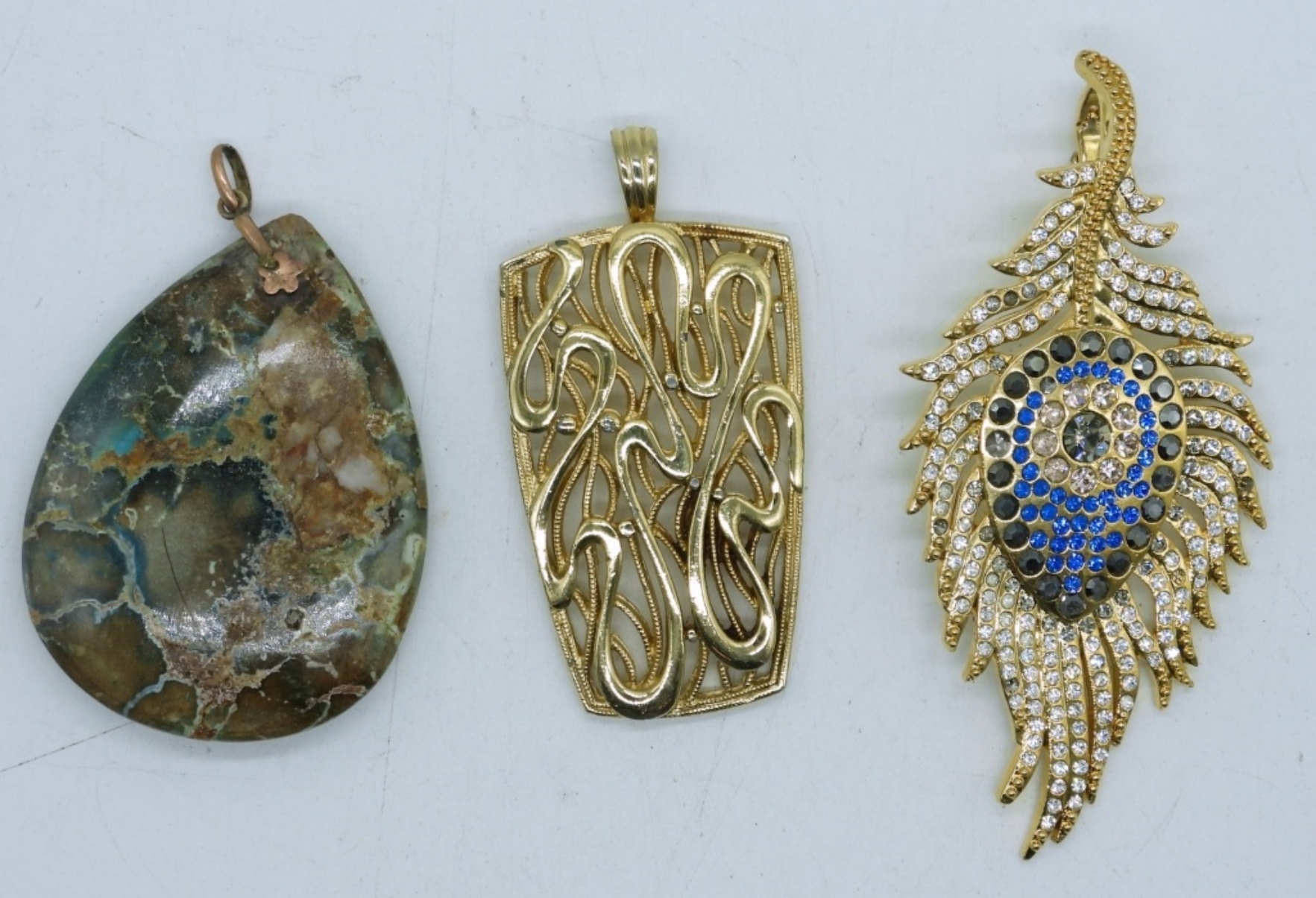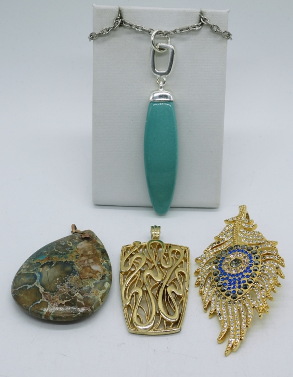FOUR PENDANTS, 2″-3.5″. CHAIN IS 24″.