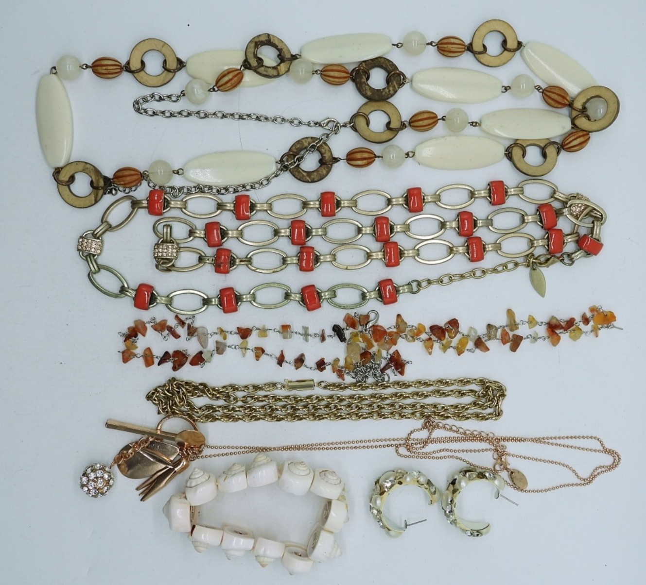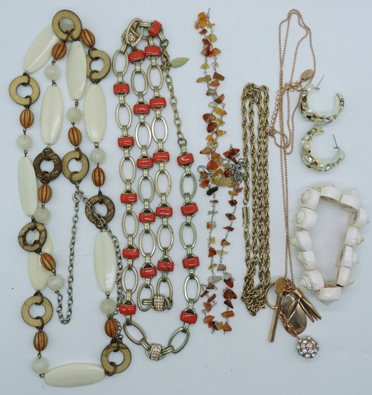 5 LADIES FASHION NECKLACES & MORE,42″ SILVER TONE BEADED NECKLACE,40″ GOLD TONE CORAL NECKLACE,28″ SILVER TONE CARNELIAN NECKLACE ,32″ROSEGOLD TONE NECKLACE WITH PENDANT,30″ GOLD TONE CHAIN,3″ SHELL BRACELET