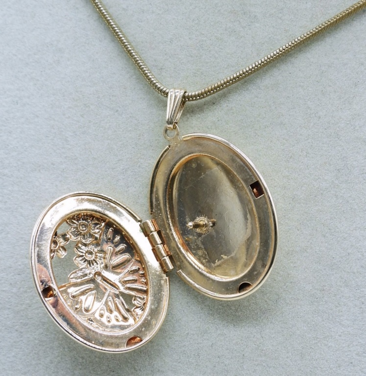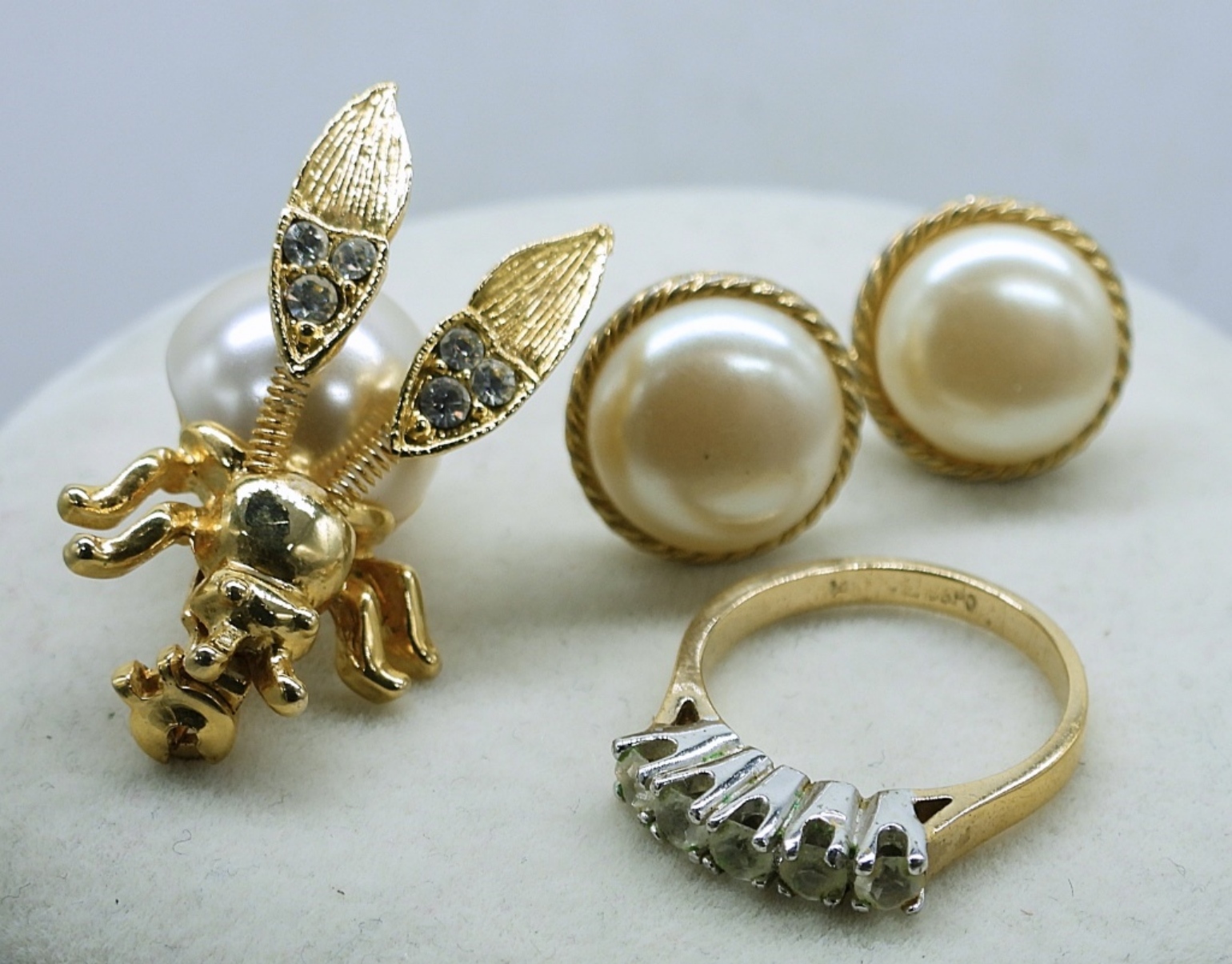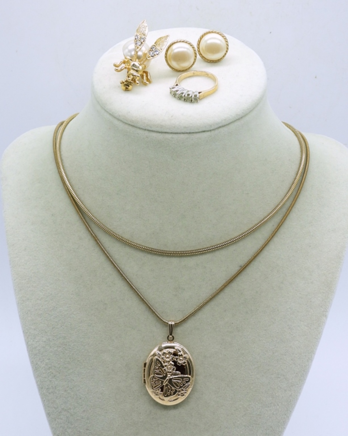 5 PIECE GOLD TONE LADIES JEWELRY SET, 18″ GOLD TONE NECKLACE WITH LOCKET PENDANT, 14″ GOLD TONE CHAIN, FAUX PEARL CLEAR RHINESTONE GOLD TONE BEE/BUG PINA PAIR OF FAUX PEARL GOLD TONE EARRINGS AND A SIZE 5 RING