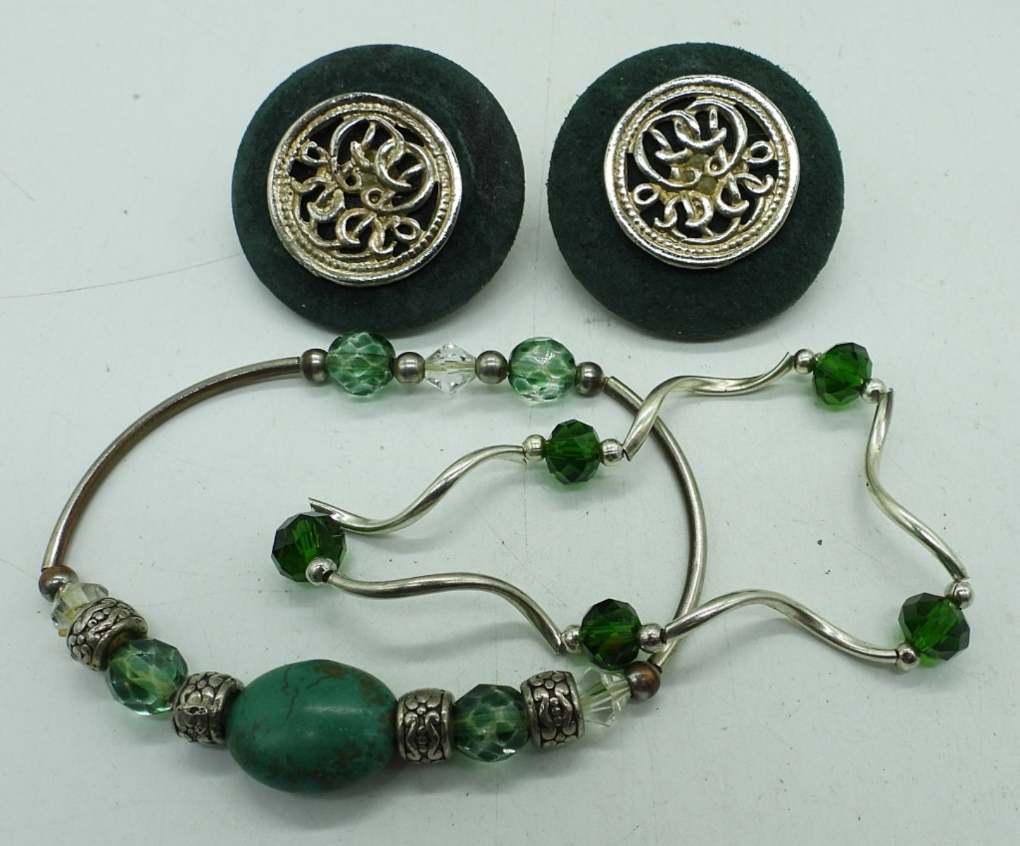 (4) LADIES EMERALD GREEN JEWELRY LOT,18″ SILVER TONE FRIDGE NECKLACE, (2) 3″ SOLVER TONE BRACELETS WITH GREEN BEADS/GEM STONES AND A PAIR OF EARRINGS