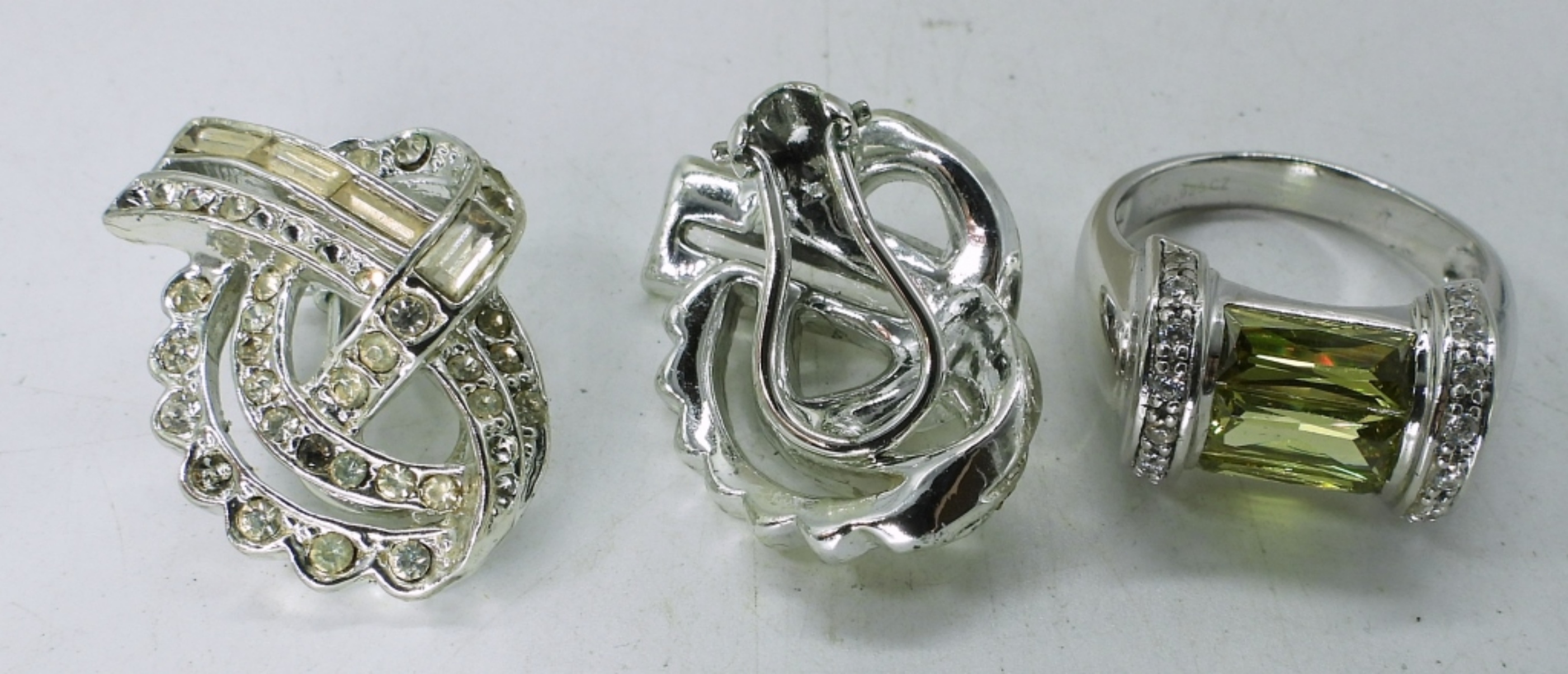 (6) LADIES SILVER TONE FASHION JEWELRY SET,16″ CHUNKY SILVER TONE NECKLACE, (3) 3″ SILVER TONE BRACELETS, A PAIR OF EARRINGS AND A SIZE 9 RING WITH A GREEN GEM