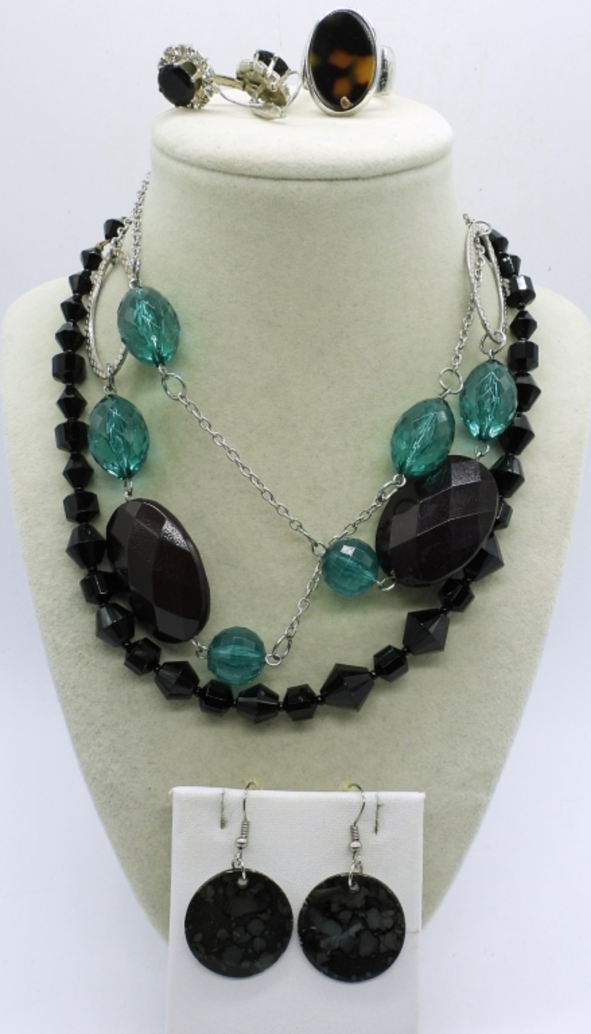 5 LADIES BLACK & SILVER TONE FASHION SET,30″ SILVER TONE NECKLACE WITH BLACK AND GREEN BEADS,16″ BLACK BEAD NECKLACE, (2 ) PAIR OF EARRINGS AND A SIZE 8 RING