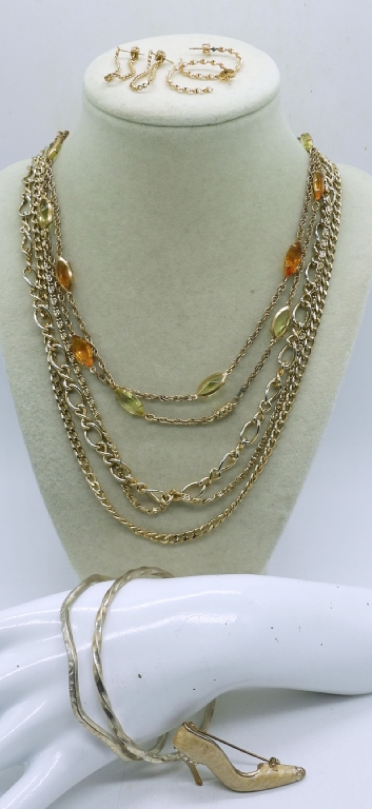(6) PIECE GOLD TONE FASHION JEWELRY SET,24″ GOLD TONE 3 STRAND NECKLACE ,24″ GOLD TONE NECKLACE WITH GREEN & ORANGE GEM STONES ,(2) 3″ BRACELETS, A GOLD TONE SHOE BROOCH AND 2 PAIR OF EARRINGS