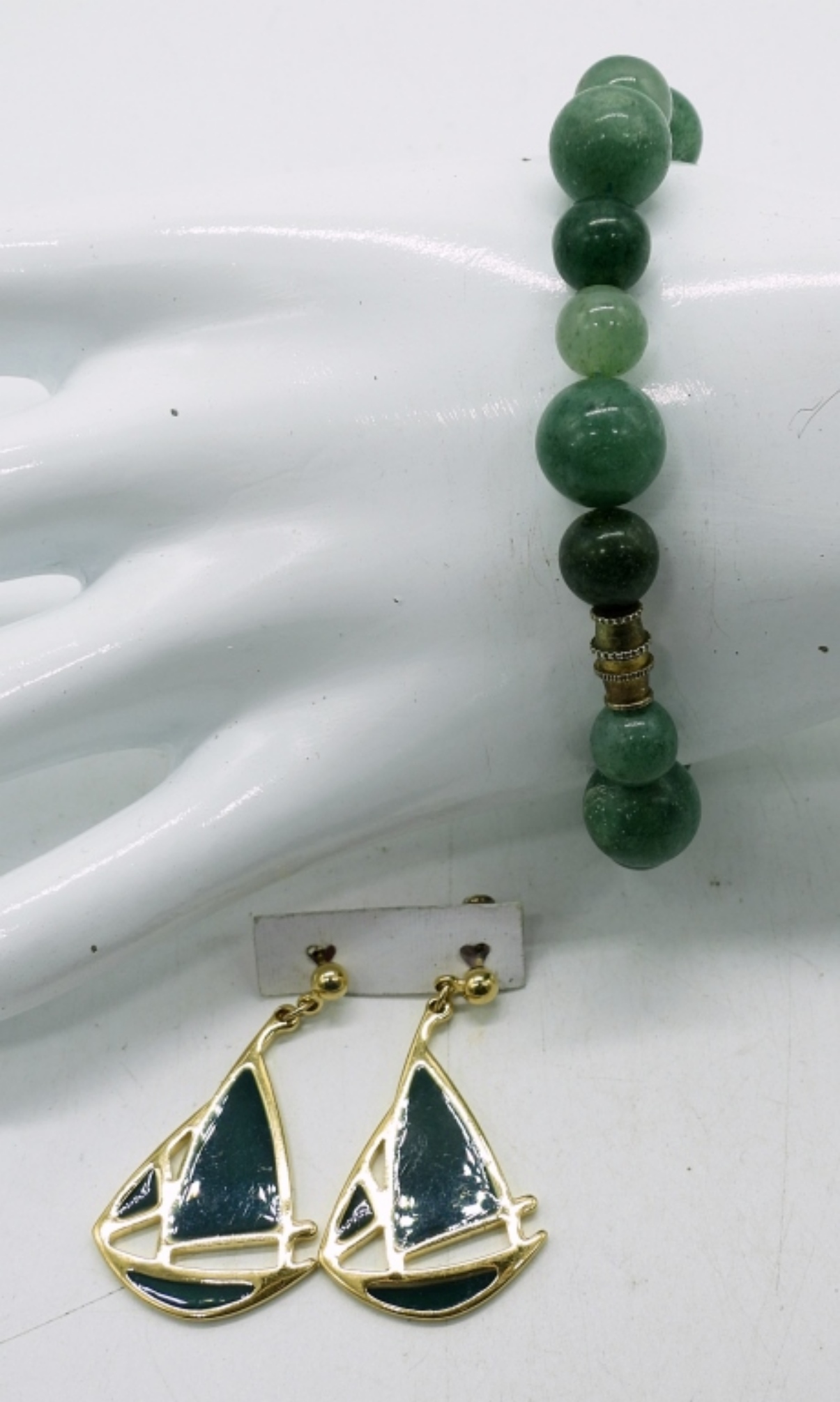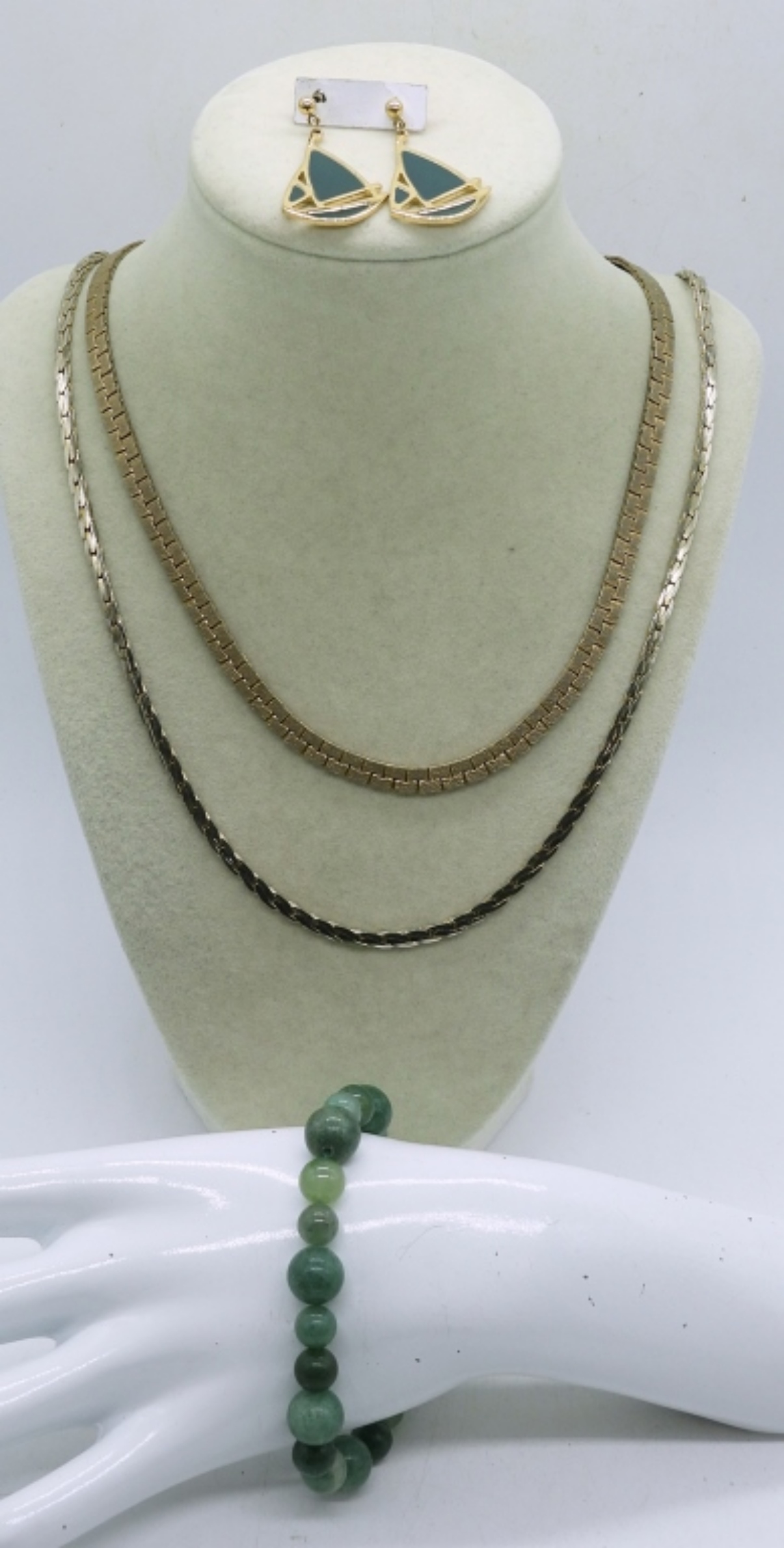 (4) PIECE LADIES GOLD TONE JADE SET,28″ GOLD TONE NECKLACE, 18″ GOLD TONE NECKLACE , A 3 ” JADE BRACELET AND A PAIR OF EARRINGS