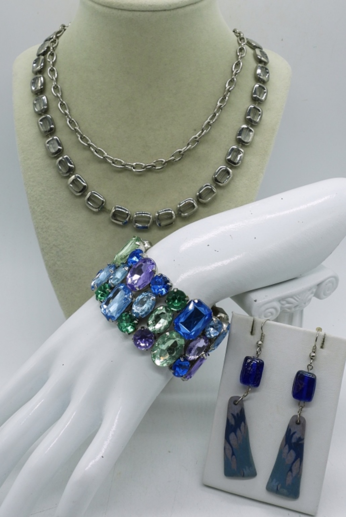 (4) SILVER TONE LADIES JEWELRY SET,18″ SILVER TONE NECKLACE, 22″ SILVER TONE NECKLACE,4″ MULTI COLOR GEM BRACELET, AND A PAIR OF EARRINGS