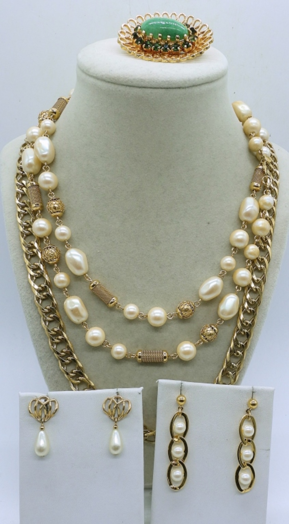 5 PIECE GOLD TONE FASHION JEWELRY SET,28″ GOLD TONE NECKLACE, 34″ GOLD TONE PEARL NECKLACE, 2 PAIR OF GOLD TONE PEARL EARRINGS, AND A GOLD TONE BROOCH WITH A GREEN GEM STONE