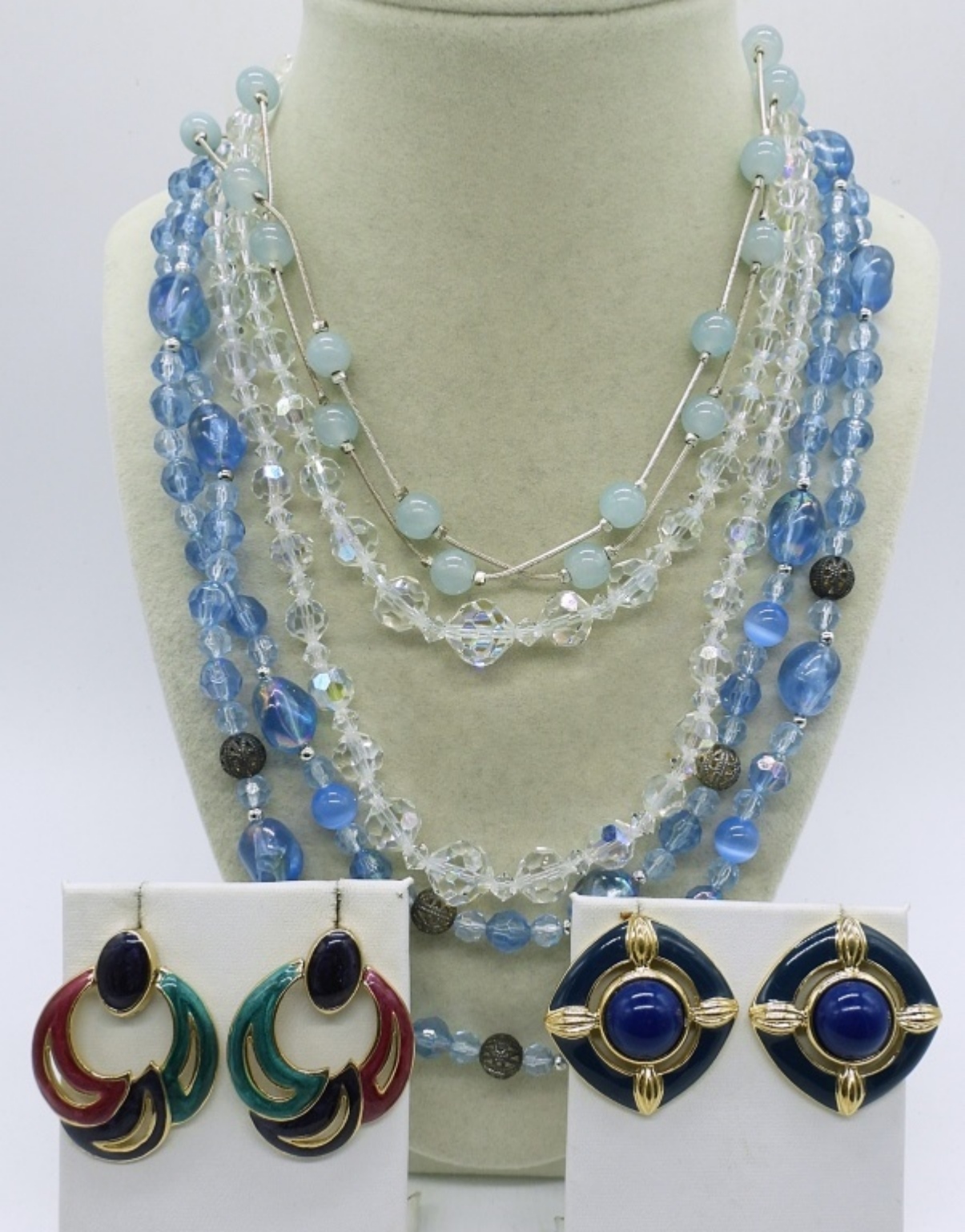 LADIES VINTAGE BLUE BEADED FASHION JEWELRY LOT,44″ SILVER TONE BLUE BEAD NECKLACE,34″ BEADED NECKLACE.18″ CRYSTAL BEAD NECKLACE, AND 2 PAIR OF EARRINGS