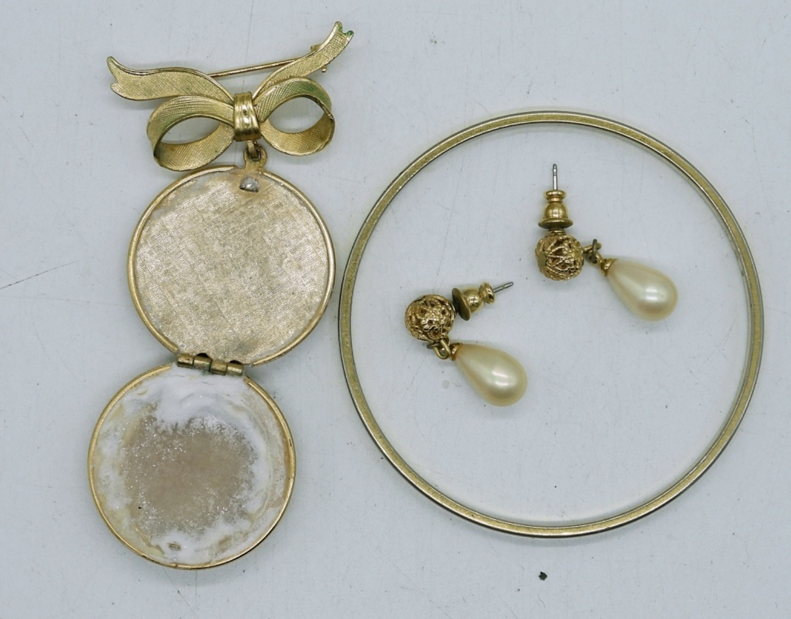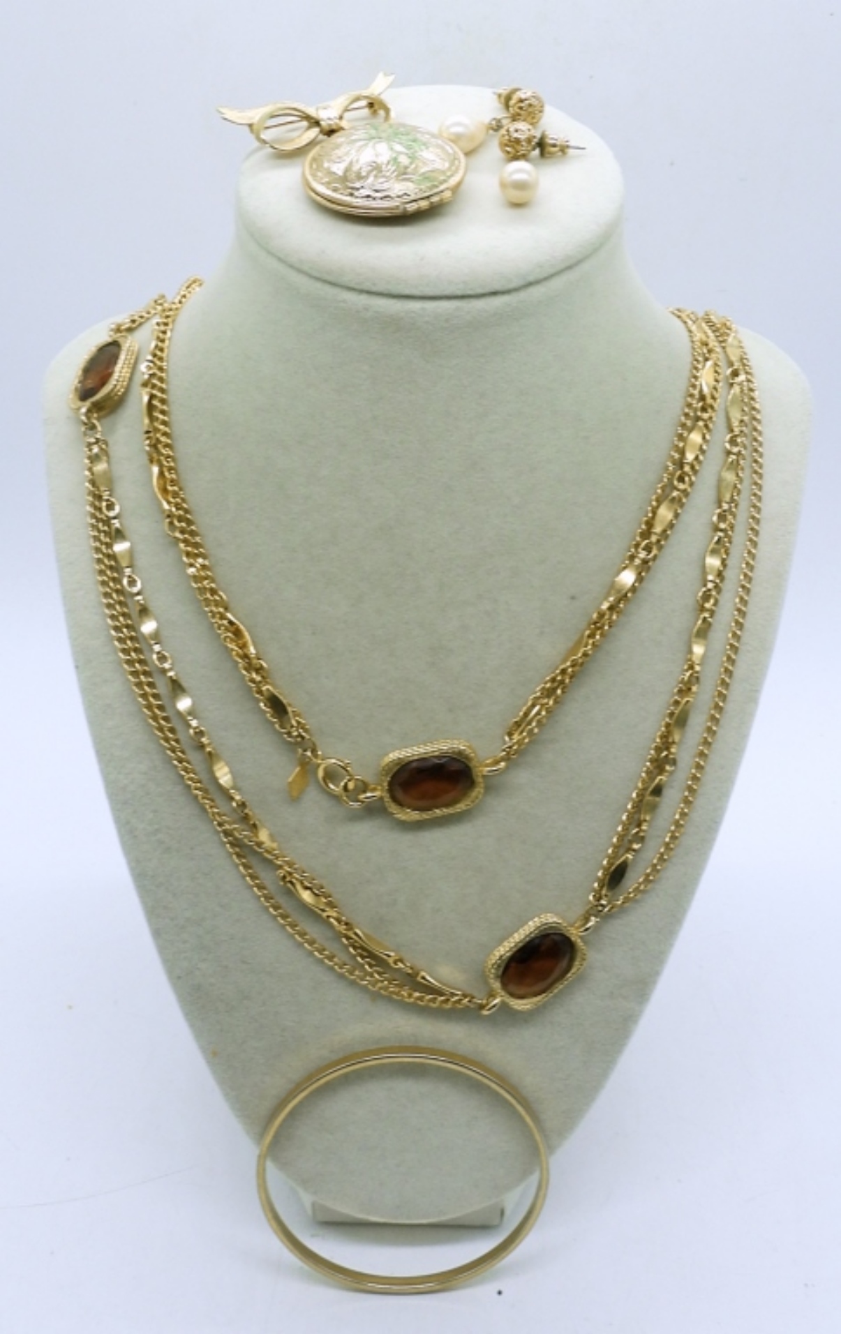 46″ SARAH COVENTRY GOLD TONE NECKLACE WITH BROWN GEMSTONES,3″ BRACELET A GOLD TONE AVON LOCKET BROOCH, AND A PAIR OF EARRINGS