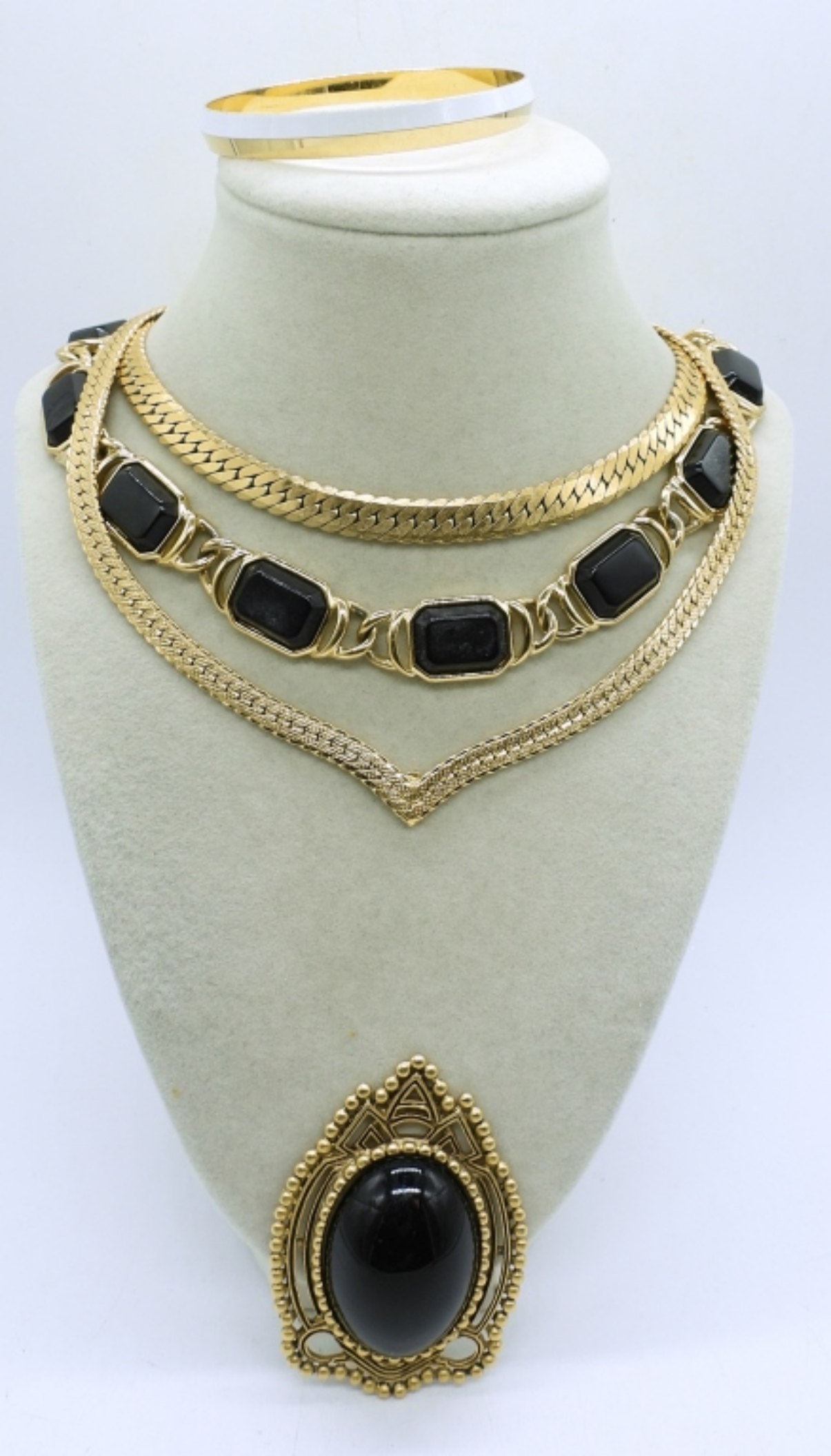 5 PIECE BLACK & GOLD TONE FASHION JEWELRY,18″ GOLD TONE NECKLACE,16″ NAPIER GOLD TONE NECKLACE 16″ GOLD TONE NECKLACE WITH BLACK GEM STONES 3″ BRACELET AND A BROOCH WITH A BLACK GEM STONE