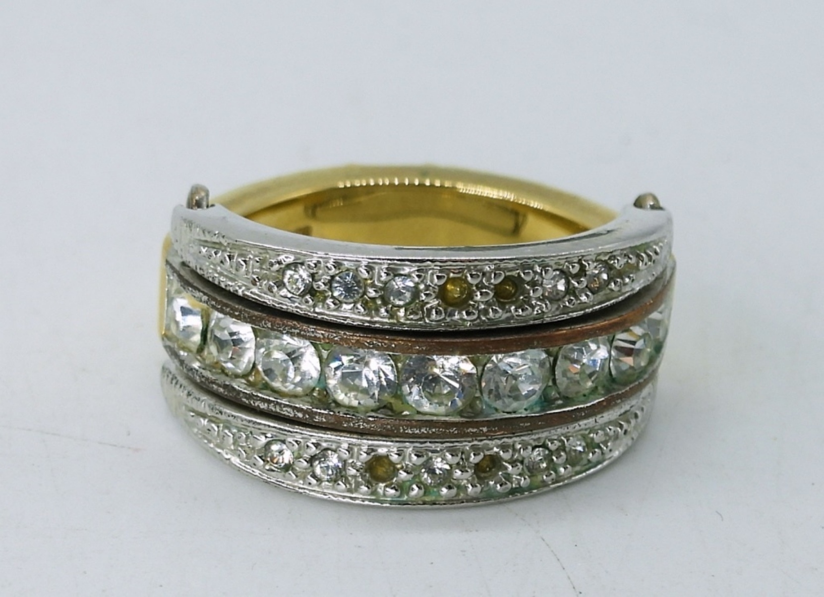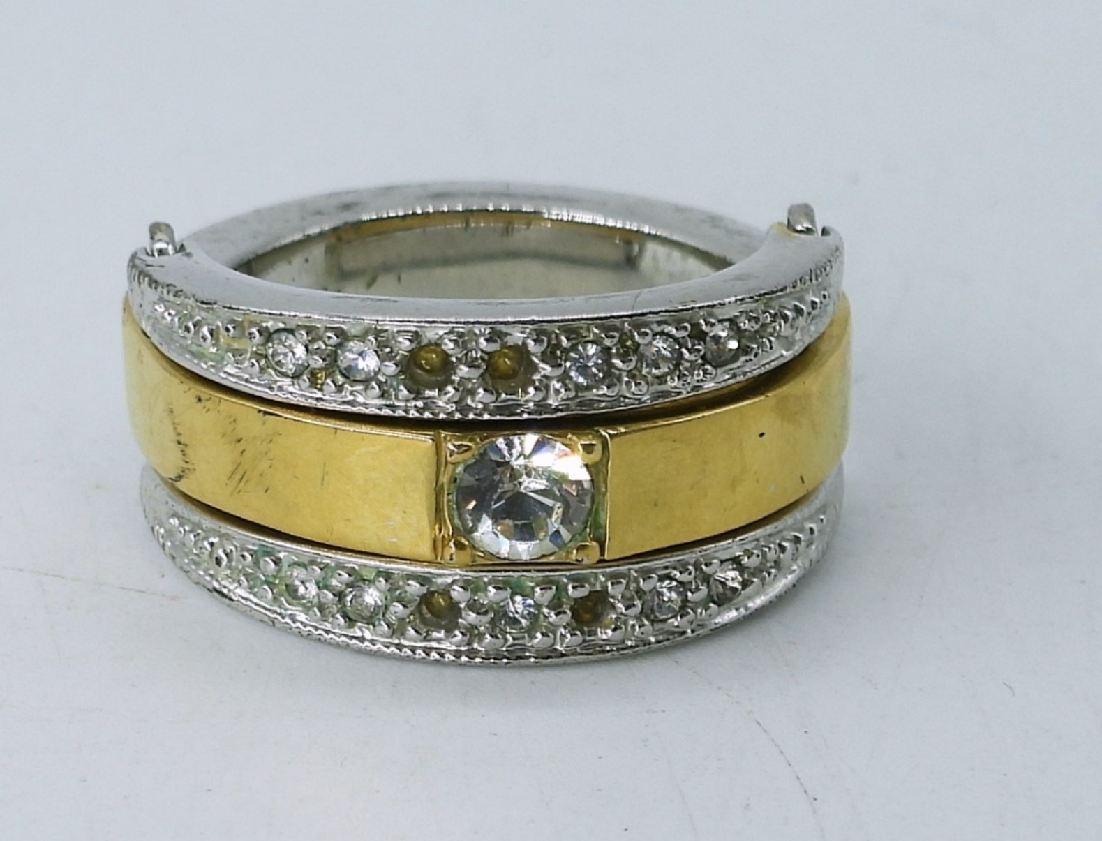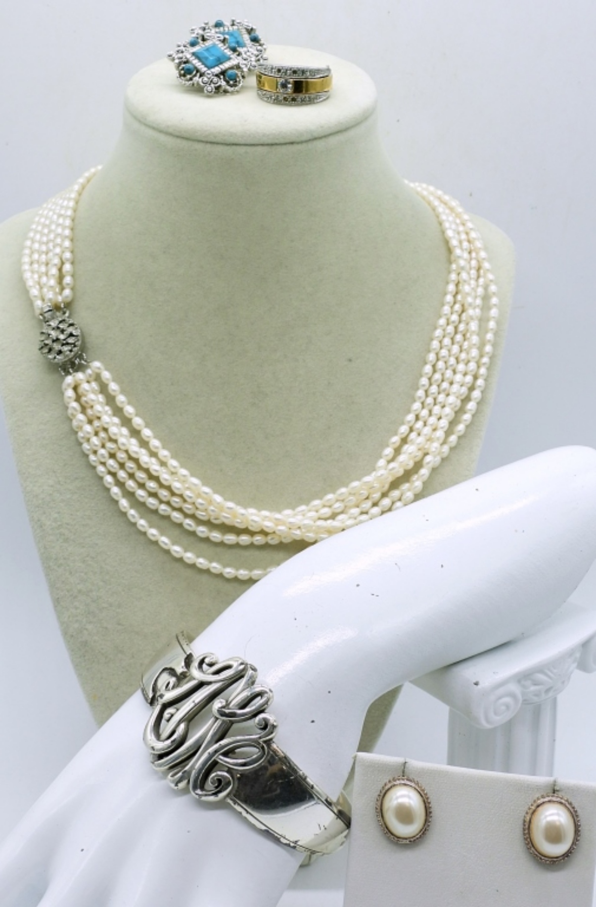 18″ LADIES 6 STRAND PEARL NECKLACE, 2 PAIR OF EARRINGS,A SILVER TONE CUFF BRACELET , RINS SIZE 6.5