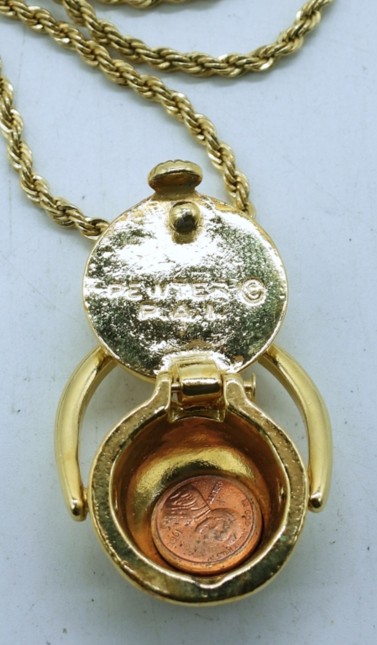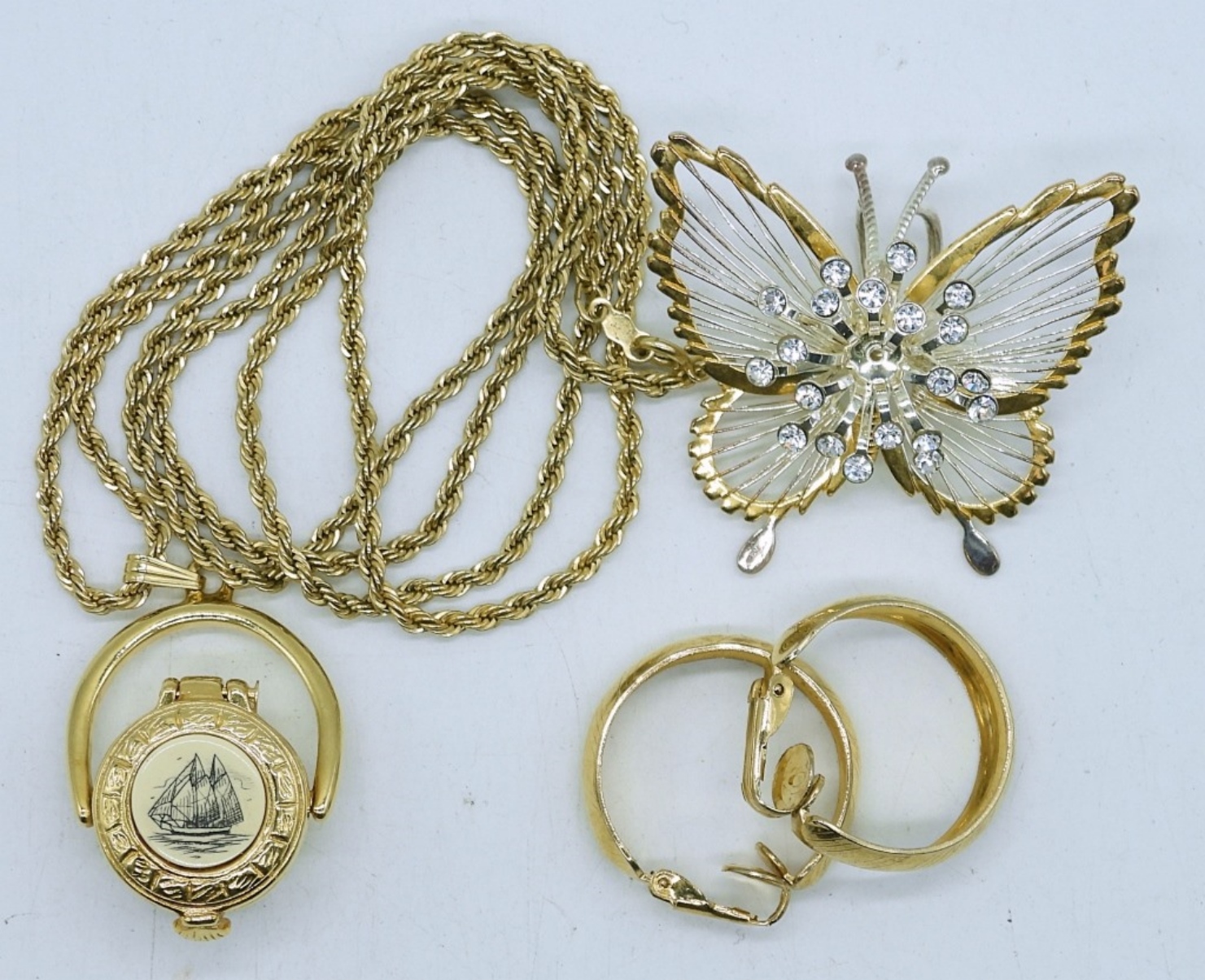 30″ GOLD TONE NANTUCKET BASKET LOCKET WITH PENNY, A PAIR OF GOLD TONE EARRINGS AND A BUTTERFLY GOLD TONE RHINESTONE BROOCH