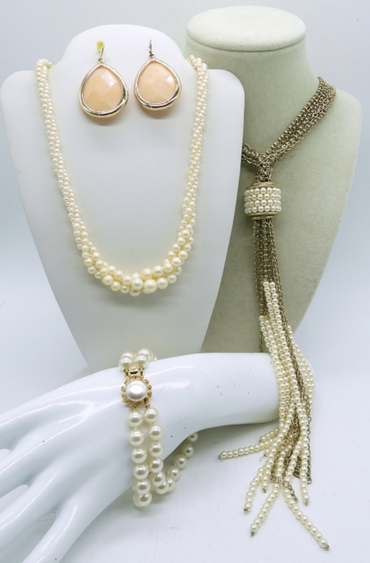 (4) PIECE PEARL GOLD TONE FASHION SET,16″ PEARL NECKLACE,26″ GOLD TONE AND PEARL NECKLACE ,3″ PEARL CLASP BRACELET AND A PAIR OF EARRINGS