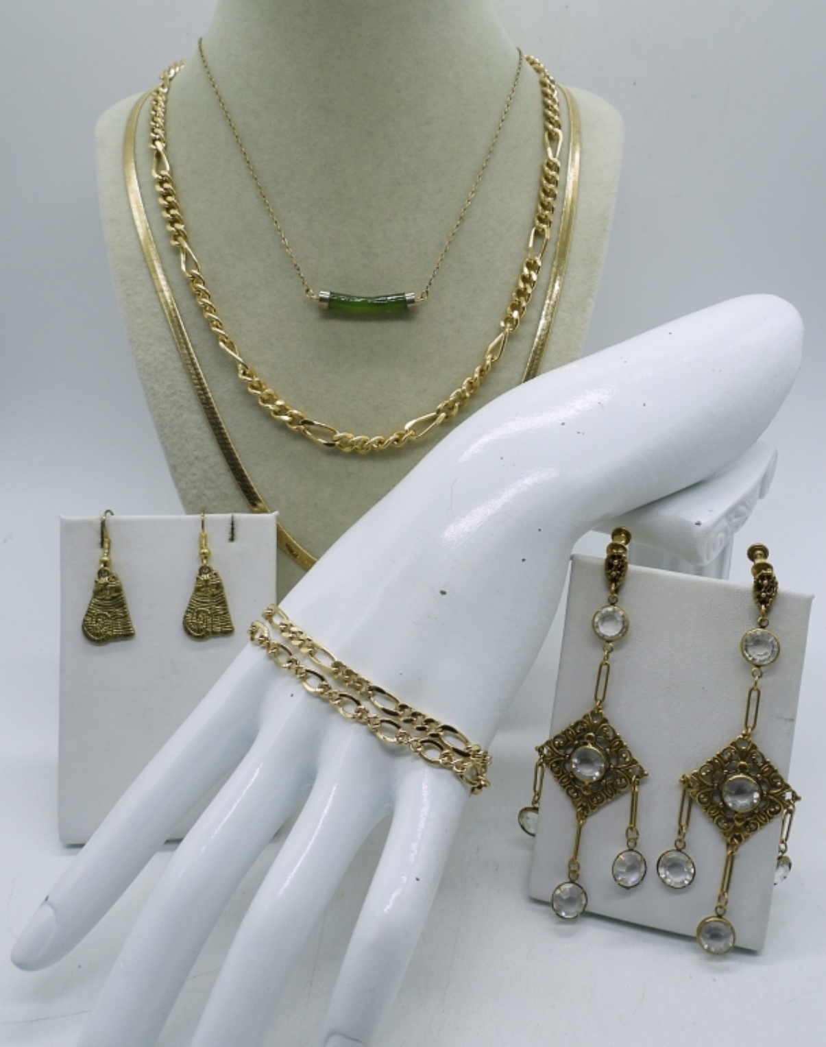 JADE NECKLACE, 16″. GOLD TONE CHAINS, 24″ & 28″. GOLD TONE CHAIN BRACELET, 8″. 2 PAIR EARRINGS, CLIP ON & PIERCED.